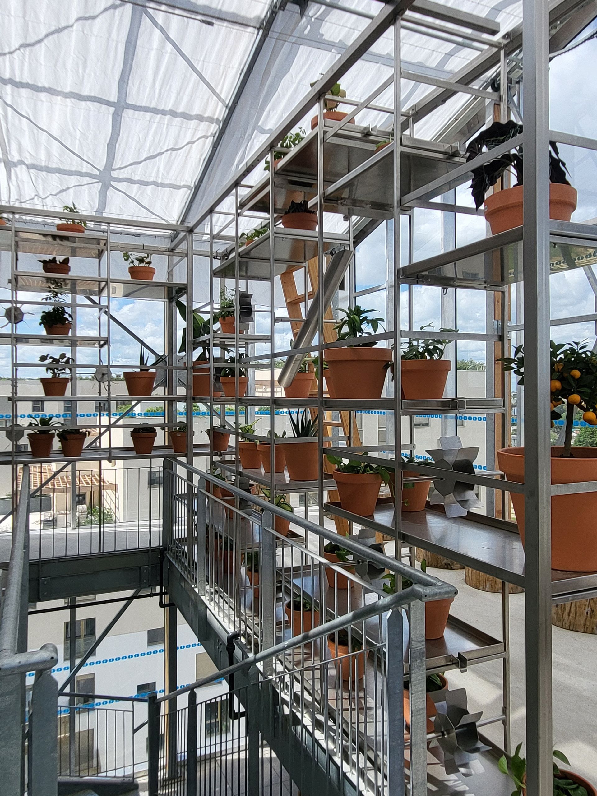 Création d'un îlot fertile tourné vers l'agriculture urbaine et la biodiversité. L'architecture végétalisée devient le support d'une continuité végétale révélant et intégrant les cycles de l'eau et de l'autofertilisation. Les réserves de biodiversité situées sur les jardins inaccessibles en toitures récupèrent les eaux de pluie qui par gravité et à l'aide d'un cheminement de chaînes de pluies et de jardinières plantées rejoignent un bassin de rétention d'eau filtrant filtre qui renvoi l'eau en toiture lors de sécheresse.