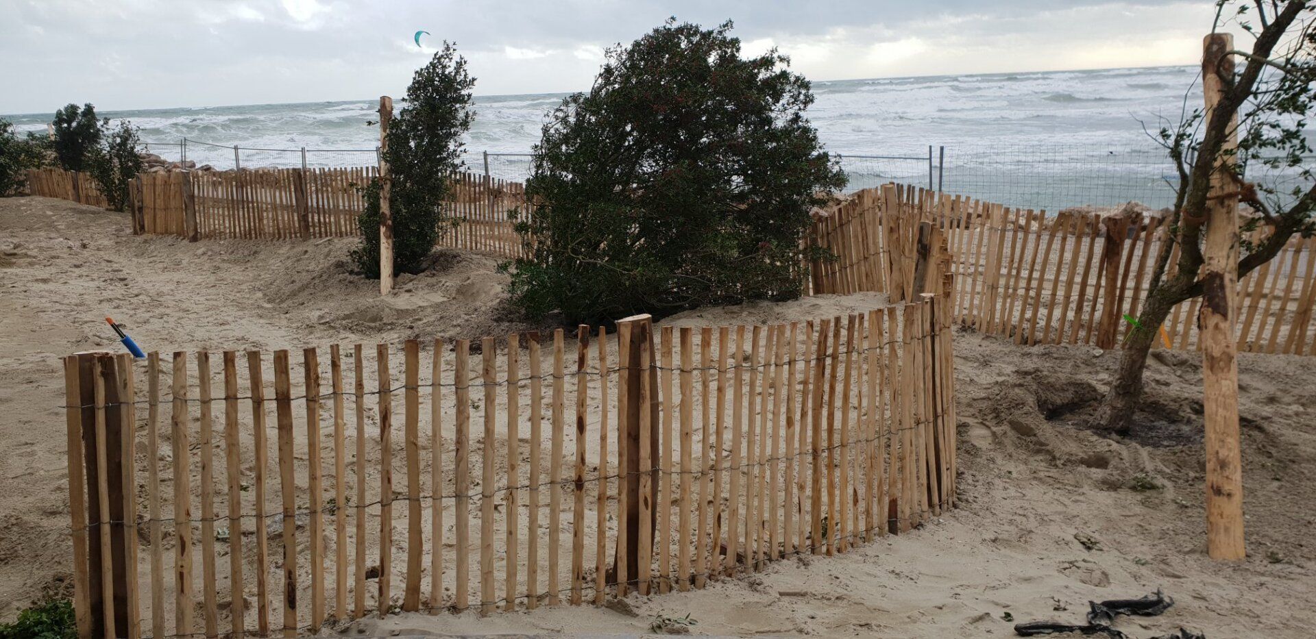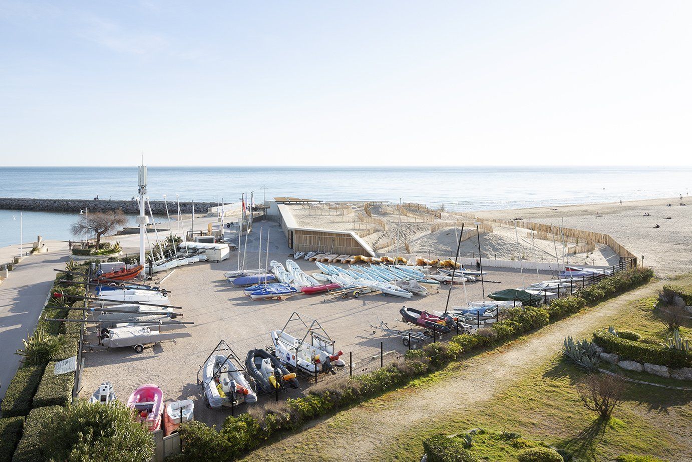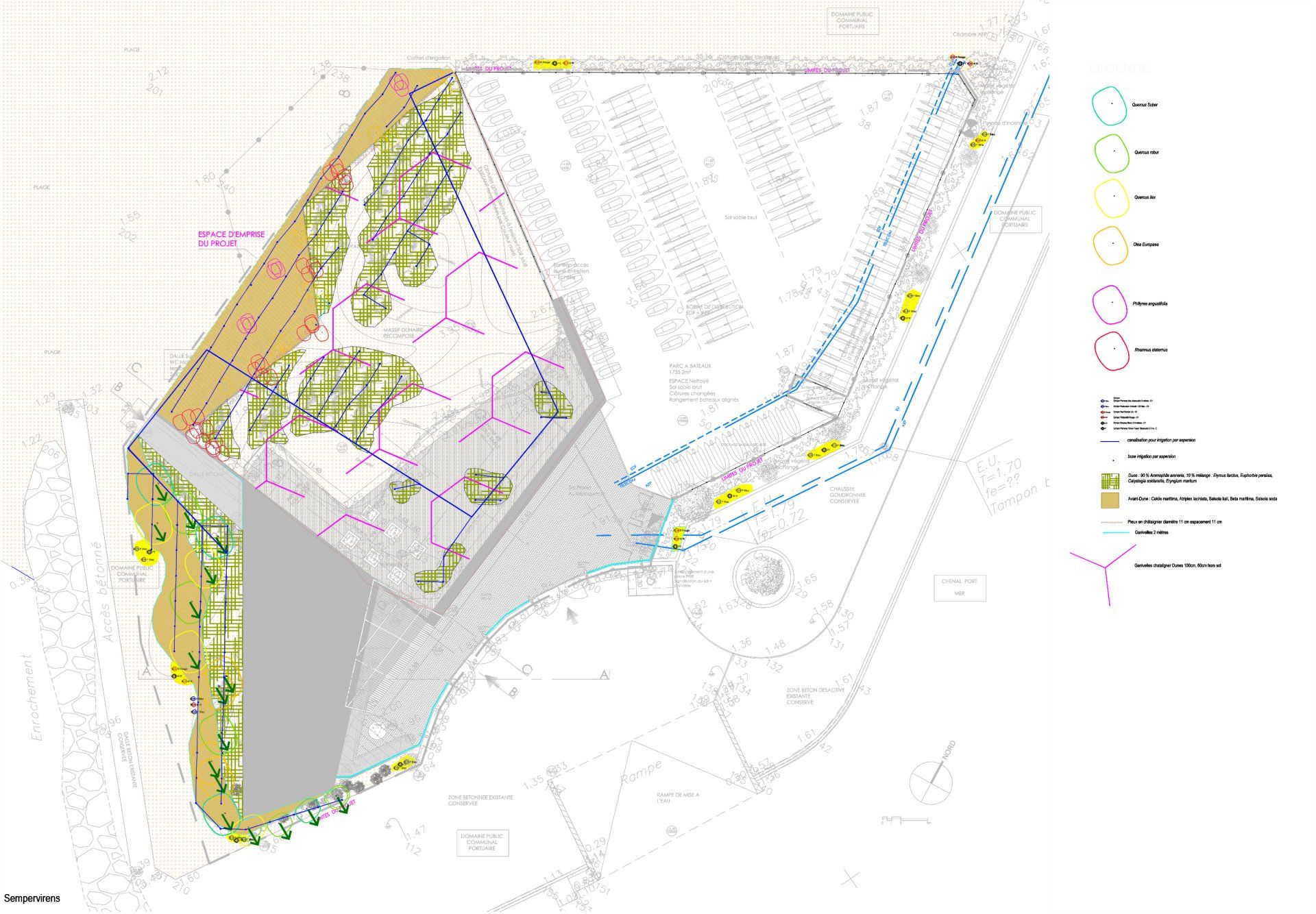 المفهوم: الكثبان الرملية الساحلية التي تستعمرها النباتات المحلية المتنوعة تندمج مع مدرسة الإبحار الجديدة. يتم تكبير الريح بواسطة النباتات التي تنحتها وتتحرك بها. السنديان الأبيض، الزيتون الأوروبي، الفستق العدس، الرهامونوس ألاتيرنوس، فيليريا أنجستيفوليا، فيكوس بوميلا، نباتات الكثبان الرملية: أمنوفيليا أريناريا، إليموس فاركتوس، يوفوربيا بارالياس، كاليستجيا سولدانيلا، إريجيوم ماريتوم. يأخذ وضع الأسوار الخشبية في الاعتبار الرياح الدوامة للموقع لتثبيت الكثبان الرملية على المبنى. يوفر تركيب الأسوار الحماية من الرياح العاتية من الشمال الشرقي والرياح الشمالية الغربية والرياح البحرية من الجنوب.
