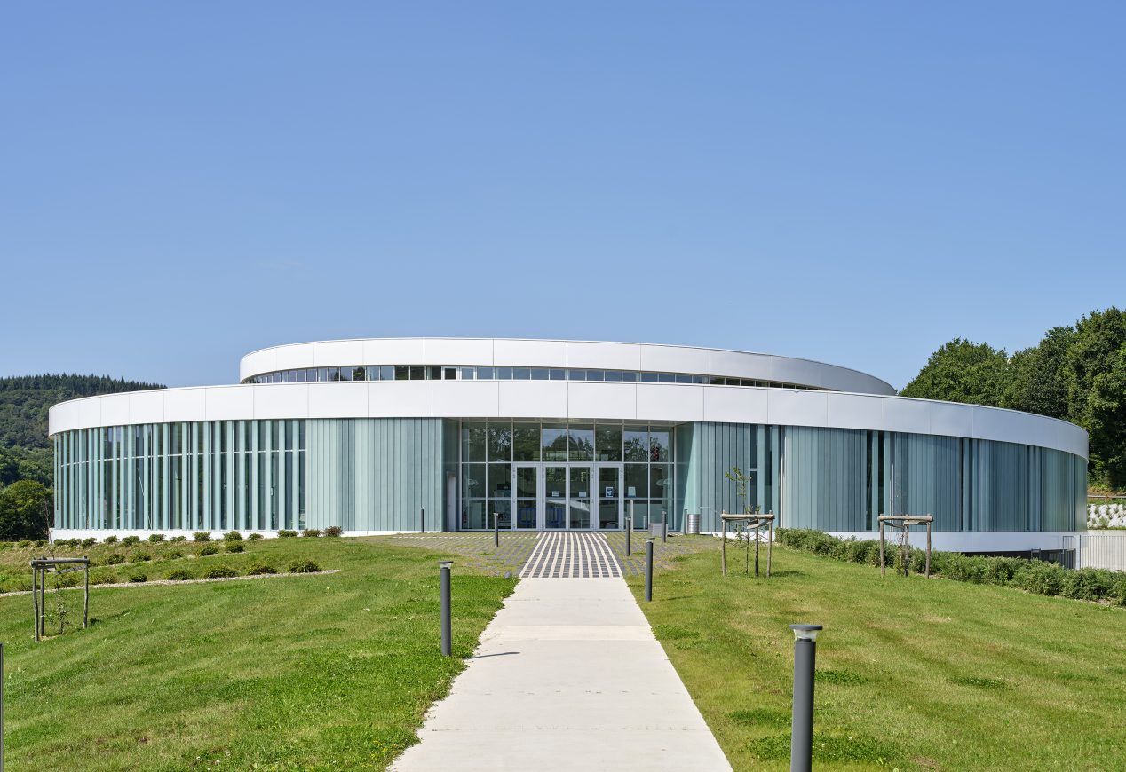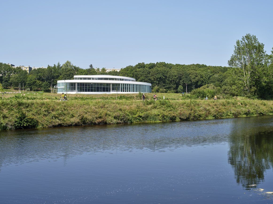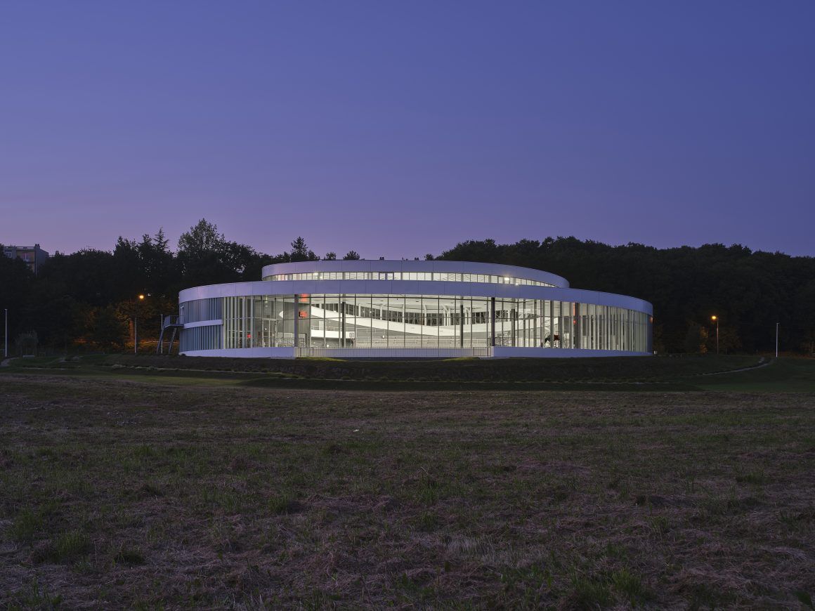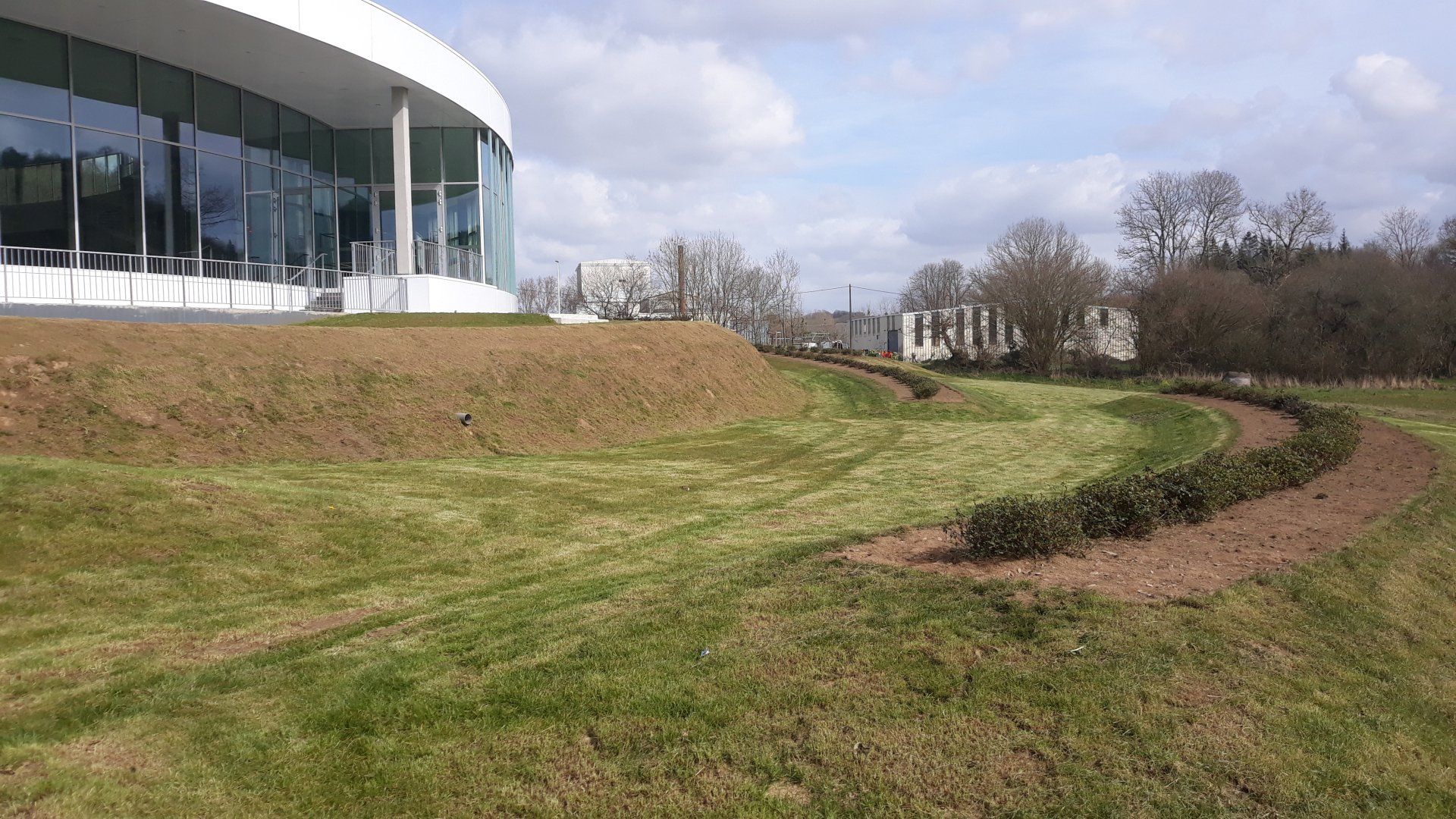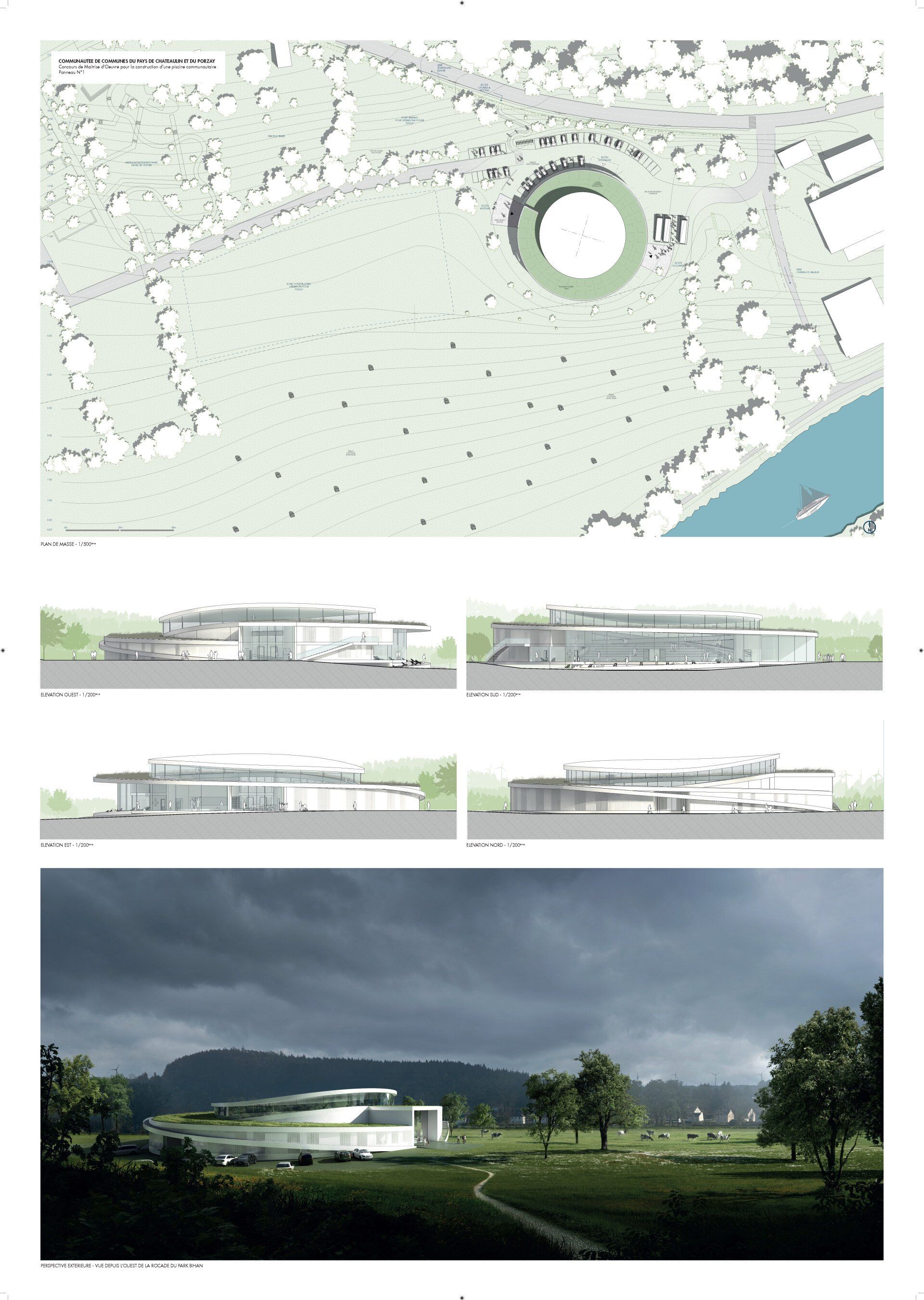 المفهوم: المفهوم: تمتزج المعدات مع المناظر الطبيعية الأكبر بفضل السقف الأخضر الذي يحيط بالمبنى. تم زراعة الساحة الأمامية للمنشأة وتم دمج موقف السيارات الخاص بها بفضل زراعة سياج بوكاج على الجسور التي تشكل حدائق شتوية. تشكل المقاعد الطوطمية المدعومة بالأشجار منحوتات حية ترحب بالمستخدمين.