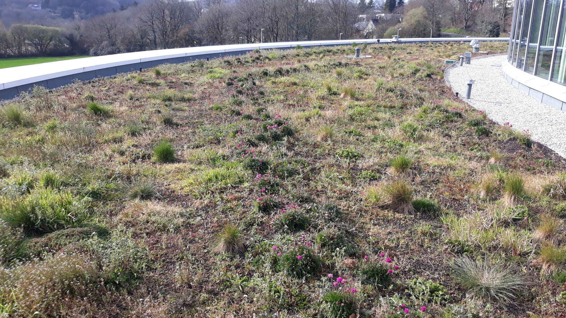 سقف أخضر، تنقية المياه الرمادية بالنباتات، مواقف سيارات خضراء، ساحة أمامية.
