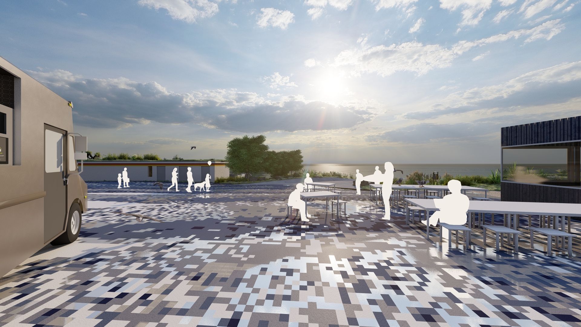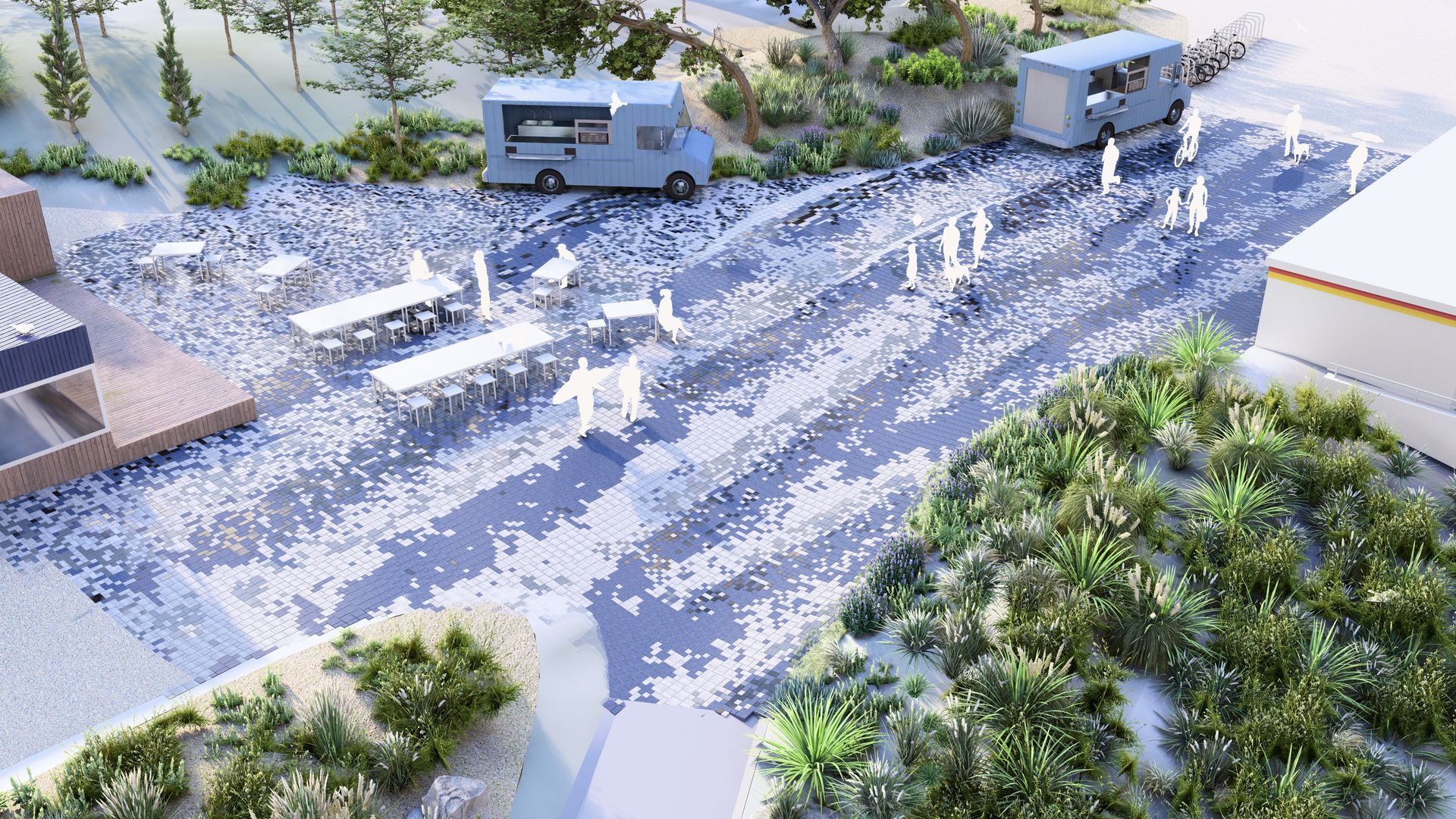 سيتم إنشاء ألعاب التصميم باستخدام أحجار الرصف المصنوعة من المحار وأصداف المحار. ويذكر تصميم الأمواج بتصميم ساحة دوم بيدرو الرابع في لشبونة أو كوباكابانا التي صممها بورليس ماركس.