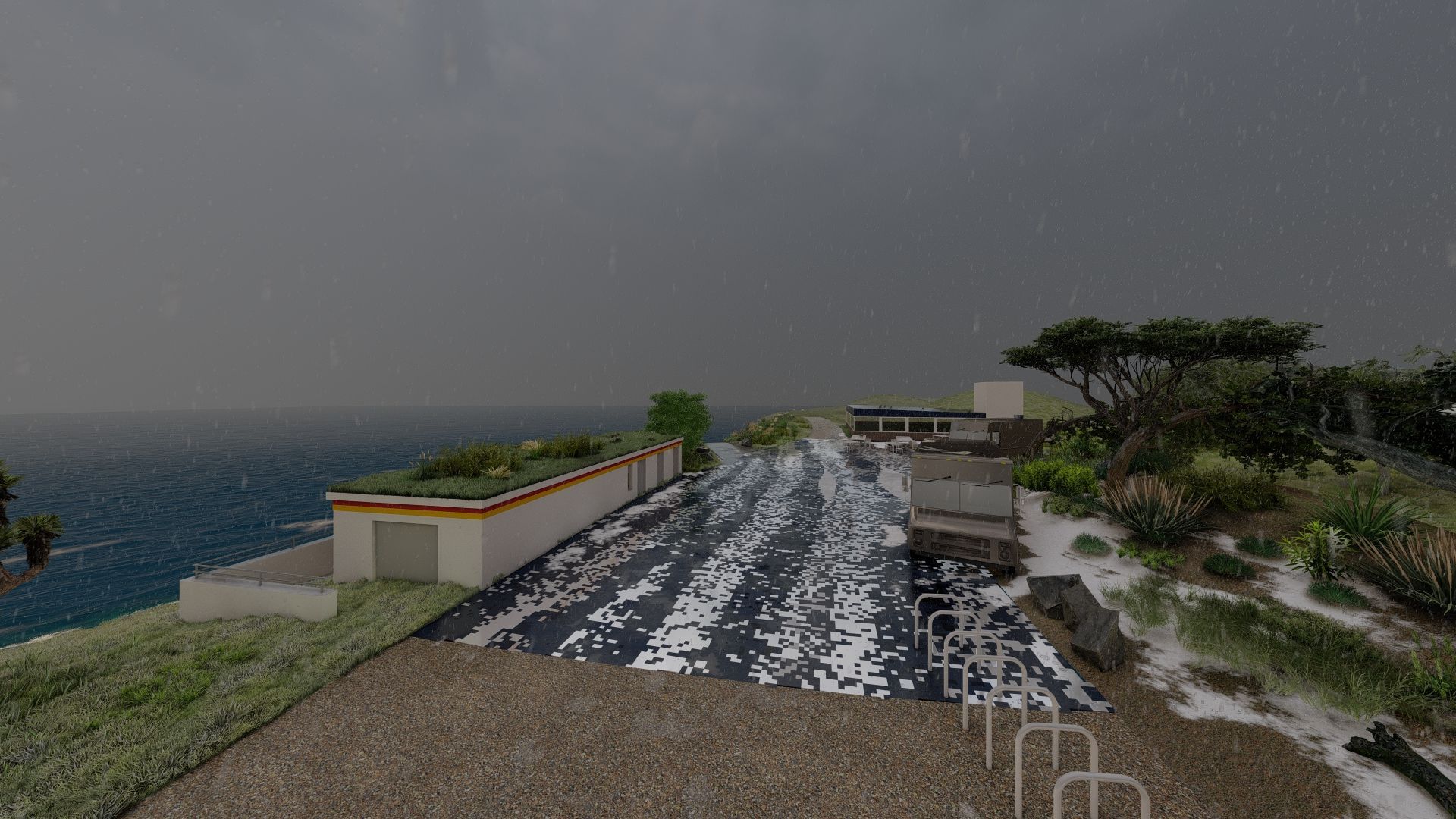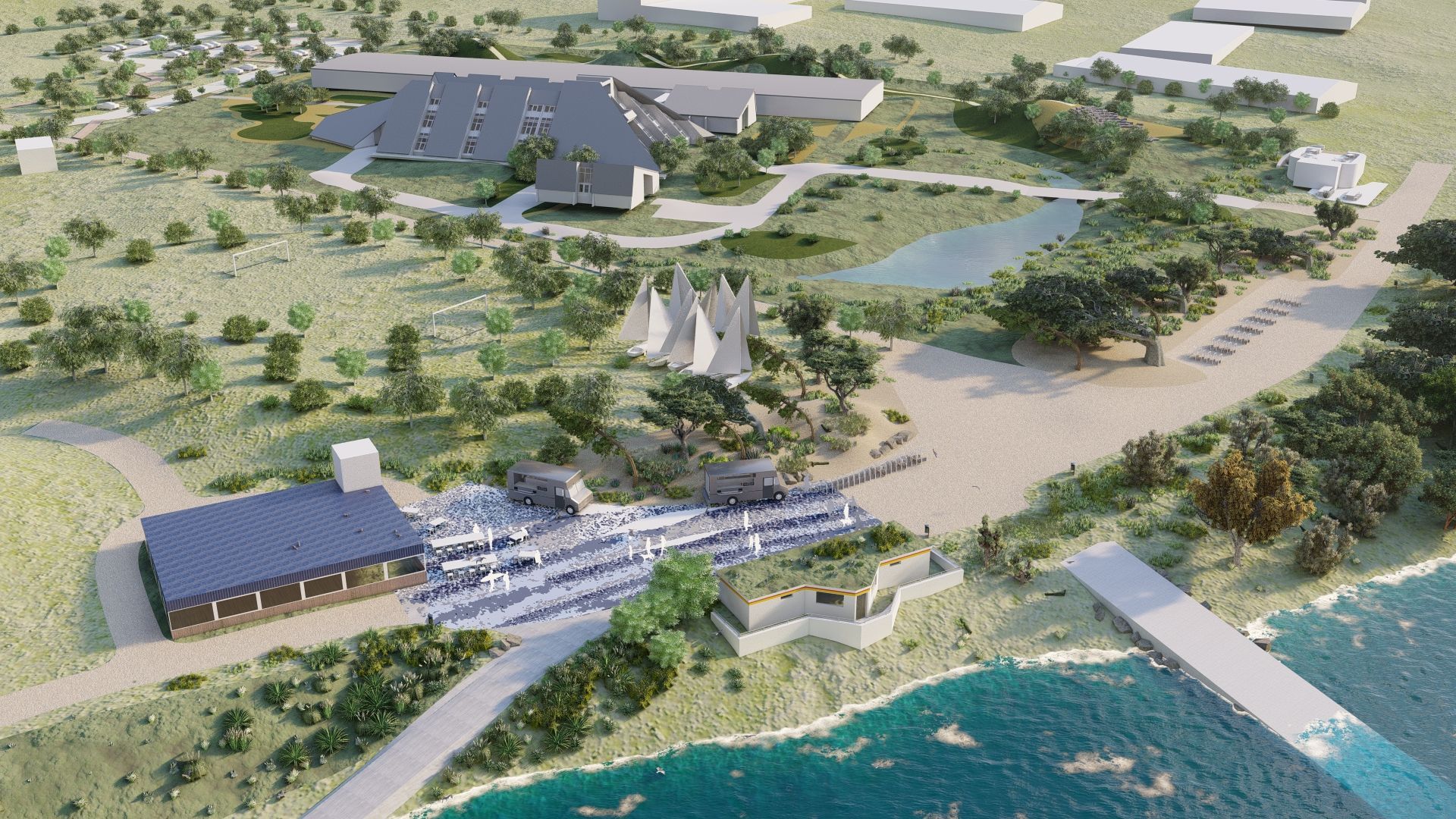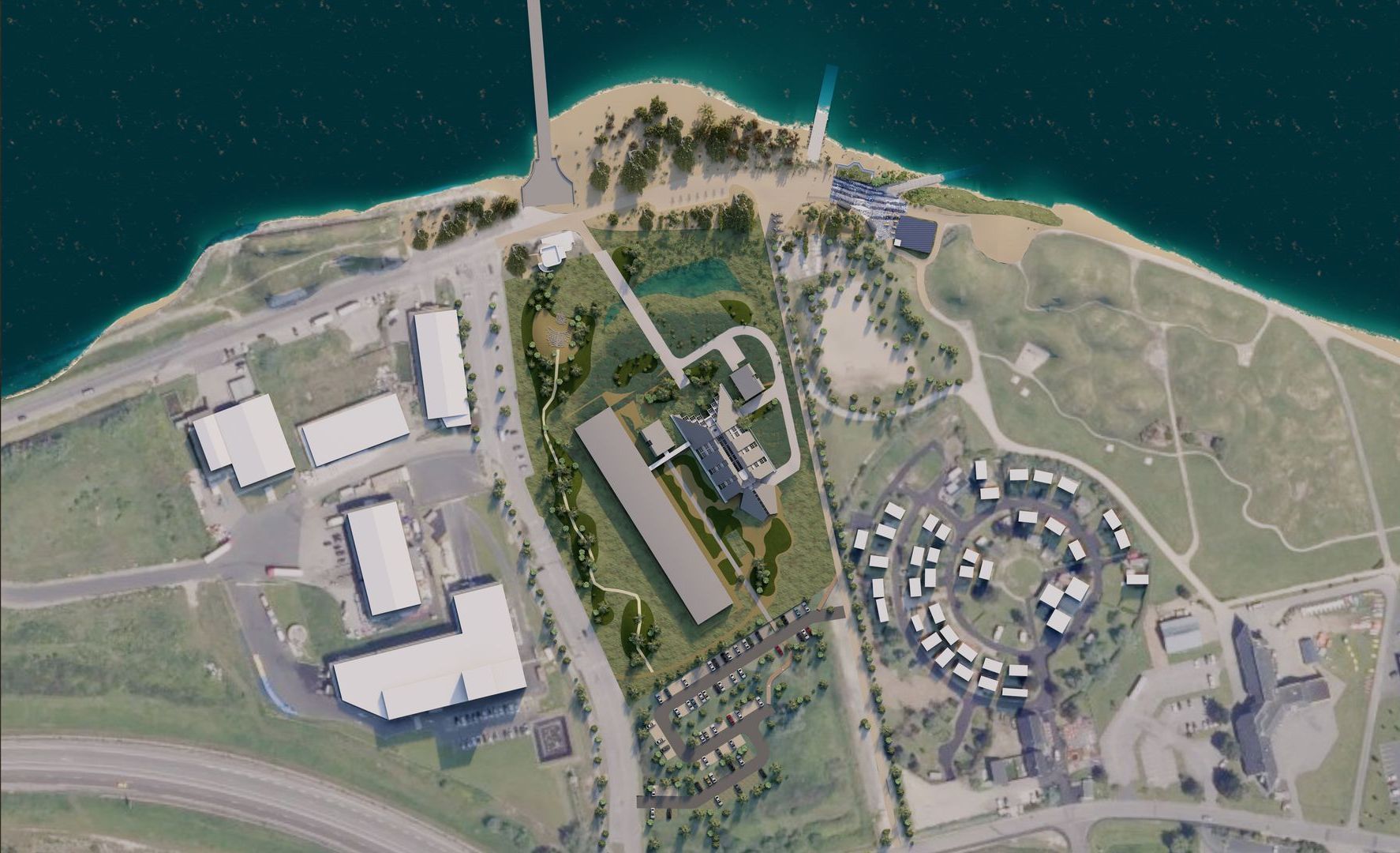 ولحماية الموقع من الرياح، سيتم زراعة الحدود الغربية بسلسلة من الكثبان الرملية بالتناوب بين الجبهة الرملية على جانب البحر - المزروعة بعشب المرام - والجوانب الخلفية المزروعة بالشجيرات النحتية مثل الغار، والصفصاف الكثباني، والزعرور، وأشجار البرقوق البري، والتي تعمل كعواكس نحتتها العواصف.