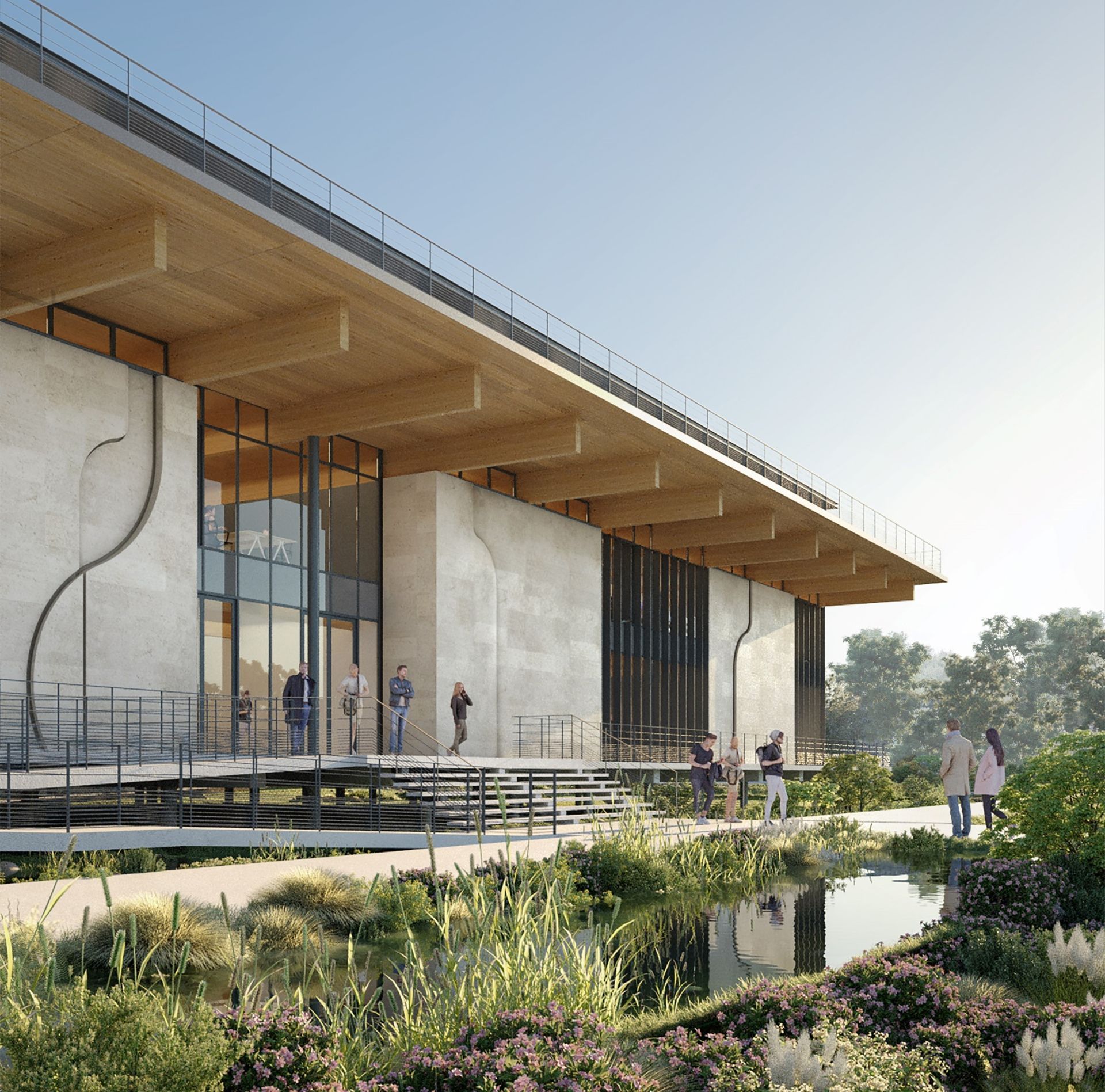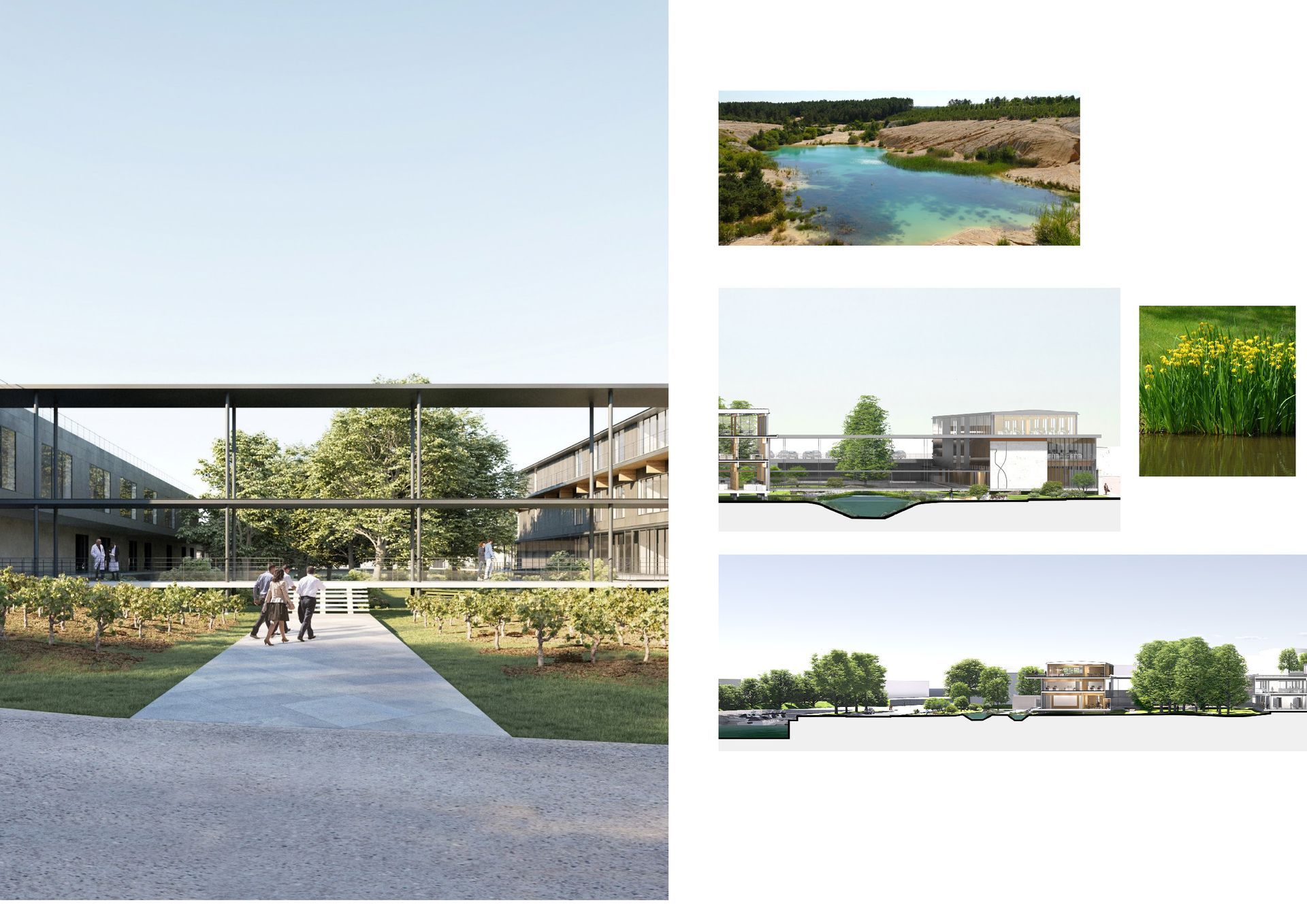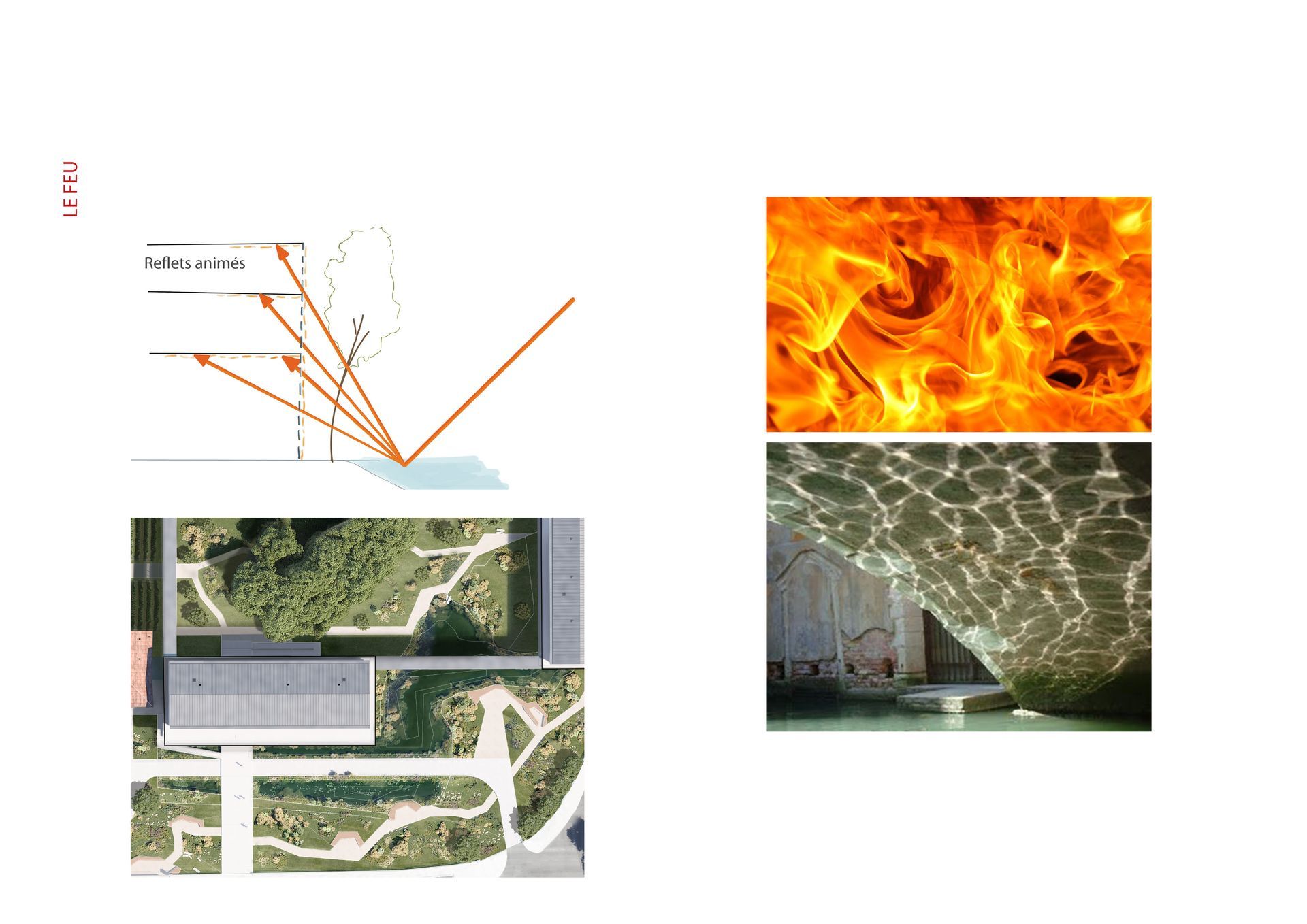 الماء: تم إعادة إنشاء المناظر الطبيعية الأساسية لضفاف نهر شارانت في الموقع. حمامات سباحة ذات مناظر طبيعية - مرايا مائية مرصعة بأشجار الألدر والقصب تدمج المبنى في قلب موقعه. تخلق ألعاب المستويات العديد من تأثيرات الانعكاس اعتمادًا على وجهات النظر.