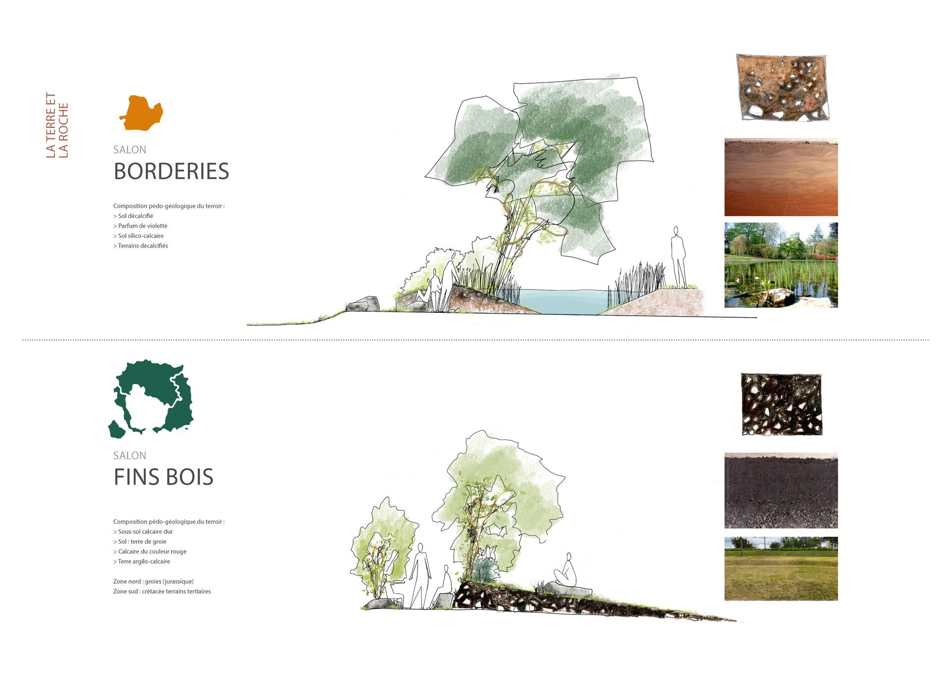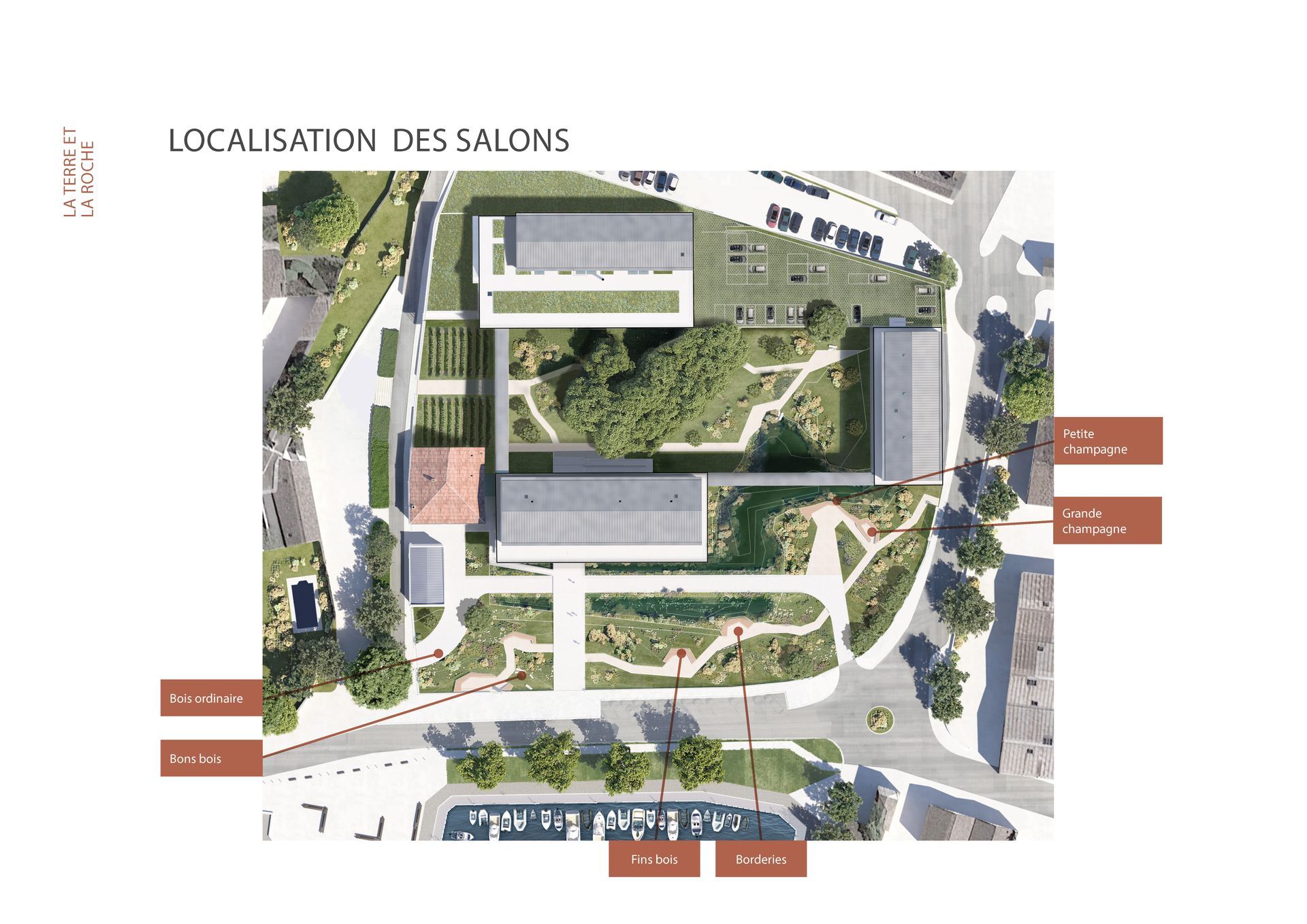 الأرض والصخور: تستحضر الحدائق جيولوجيا المناطق الستة في كونياك. على طول نهر شارينت، تتضمن سلسلة من المدرجات المزروعة الموازية للنهر مراحل لاستضافة الحفلات الموسيقية خلال مهرجان كونياك للجاز، بالإضافة إلى مساحات أكثر حميمية في قلب هذه الحديقة المفتوحة على النهر. في هذه المساحة المفتوحة، تعرض مراحل الصالة تضاريس الكونياك المختلفة من Bois Ordinaires إلى Grande Champagne. تمت إعادة بناء الوجوه الجيولوجية الستة وآفاقها بشكل مرح باستخدام الخرسانة الأرضية لإنشاء صالات ذات مناظر طبيعية مع مقاعد من الحجر الجيري.