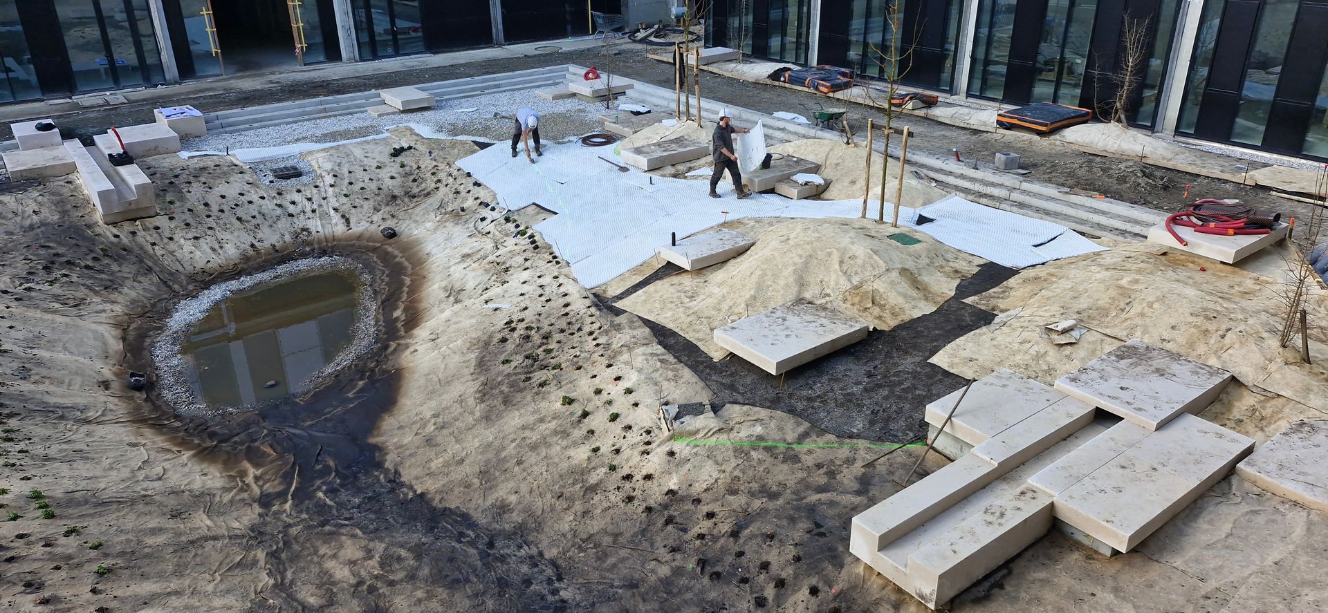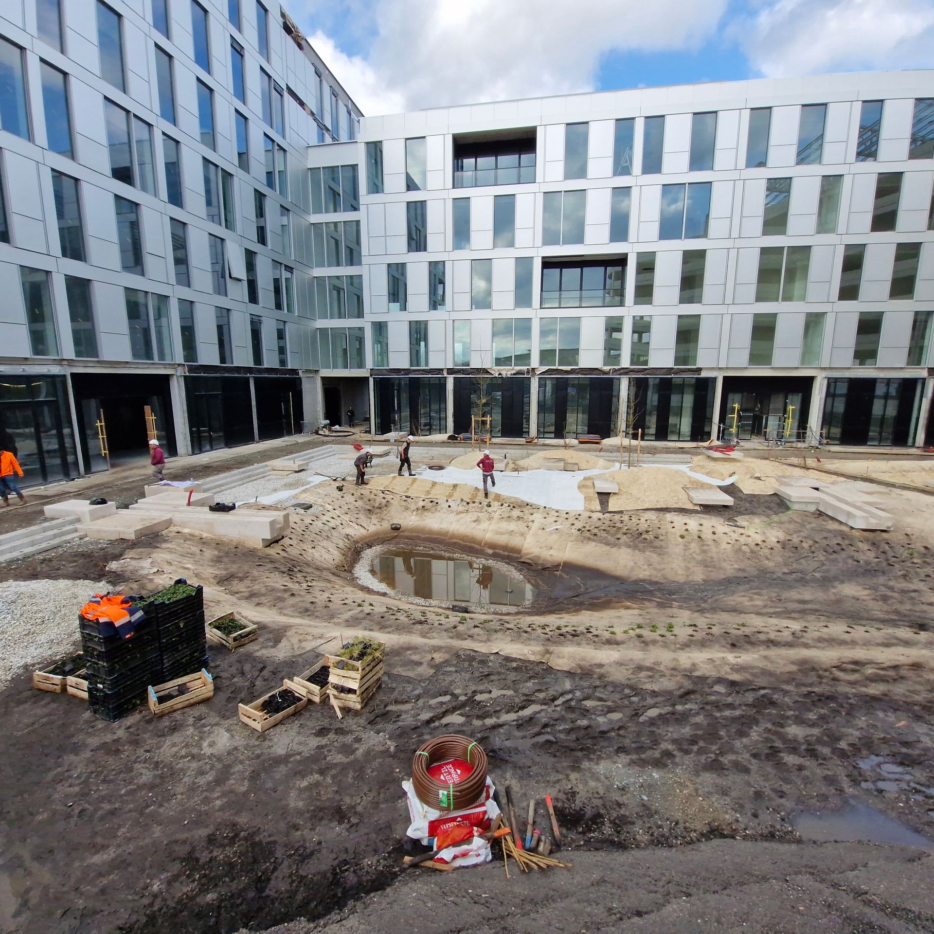 يتضمن المشروع إنشاء بركة مائية تحتوي على تماثيل منحوتة مصنوعة من الحجر المقطوع تذكرنا بأعمال كارلو سكاربا. يسمح الجهاز بجمع مياه الأمطار وري موقف الصومعة المزروعة. تتميز الجزيرة بأكملها بحدائق متعددة البيئات تتألف من مجموعة واسعة ومتنوعة من نباتات بوردو الأصلية.
