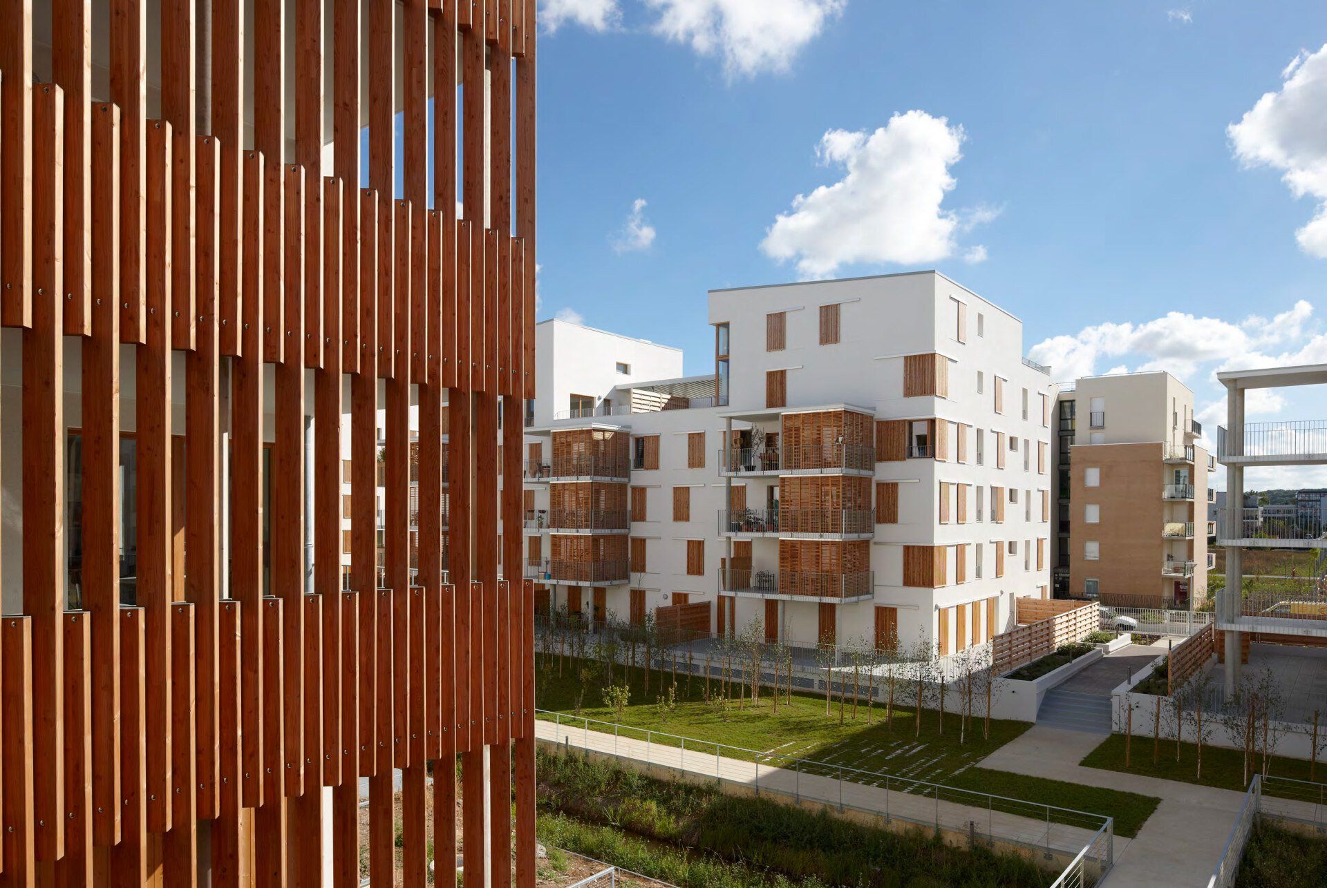 المفهوم: يتطور تصميم البنوك أثناء هطول الأمطار لتقديم منظر طبيعي متغير، ويكون الشكل معماريًا أو طبيعيًا أثناء العواصف. توسيع الفيضانات ومنطقة احتجاز مياه الأمطار (فيضانات كل خمسين عامًا 800 متر مكعب)، وإعادة إدخال النباتات والحيوانات الأصلية. دراسات ANMA (FC AILLET)، مراقبة موقع بناء OPC Paysage: Sempervirens