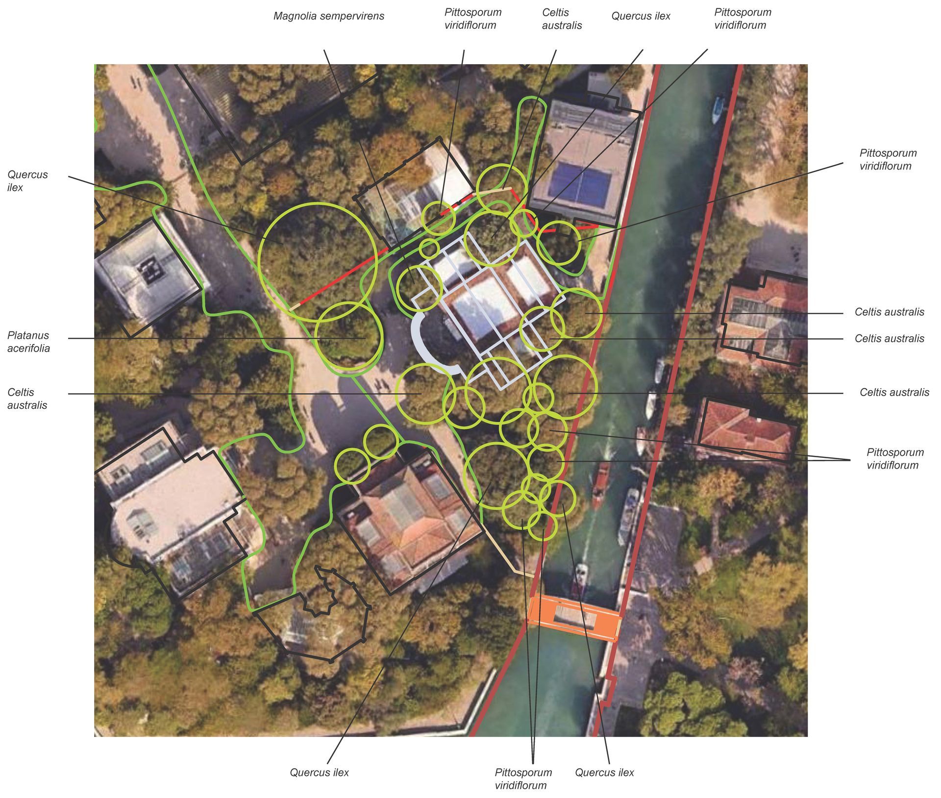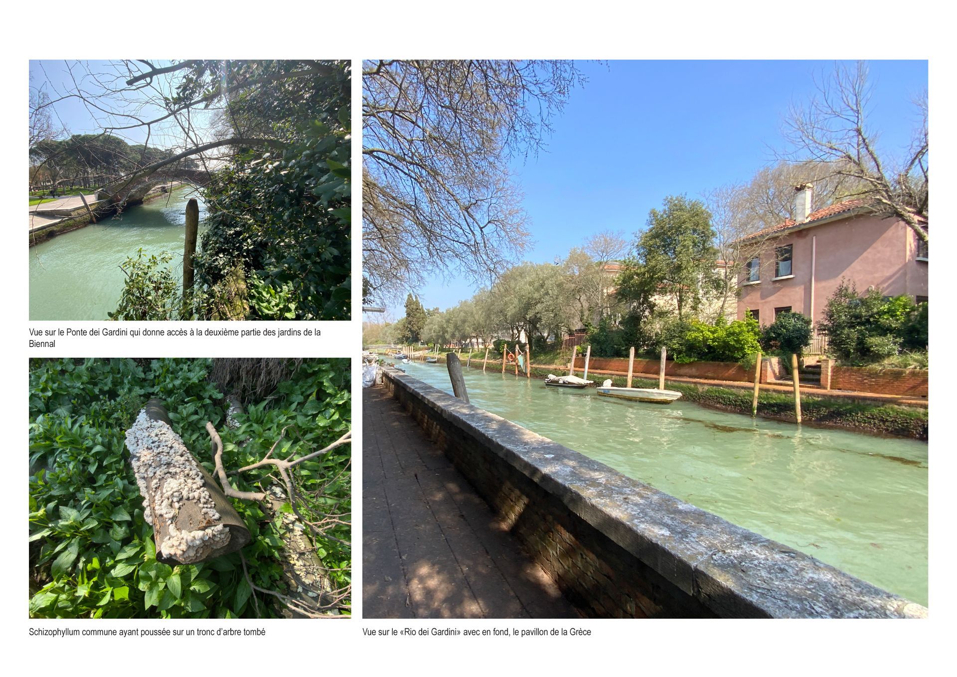 "VIVRE AVEC ", momentanément fermé pour des travaux de restauration, le Pavillon Français dans les Giardini n'est pas abandonné, nous installons à côté de lui, nous nous greffons sur son chantier et explorons le bois entre le pavillon existant et le canal, la structure temporaire se pose légèrement dans la nature.