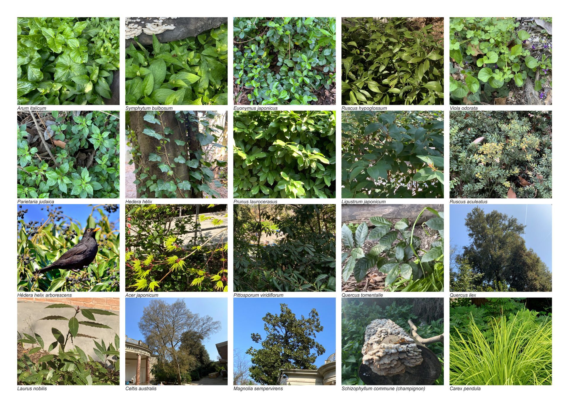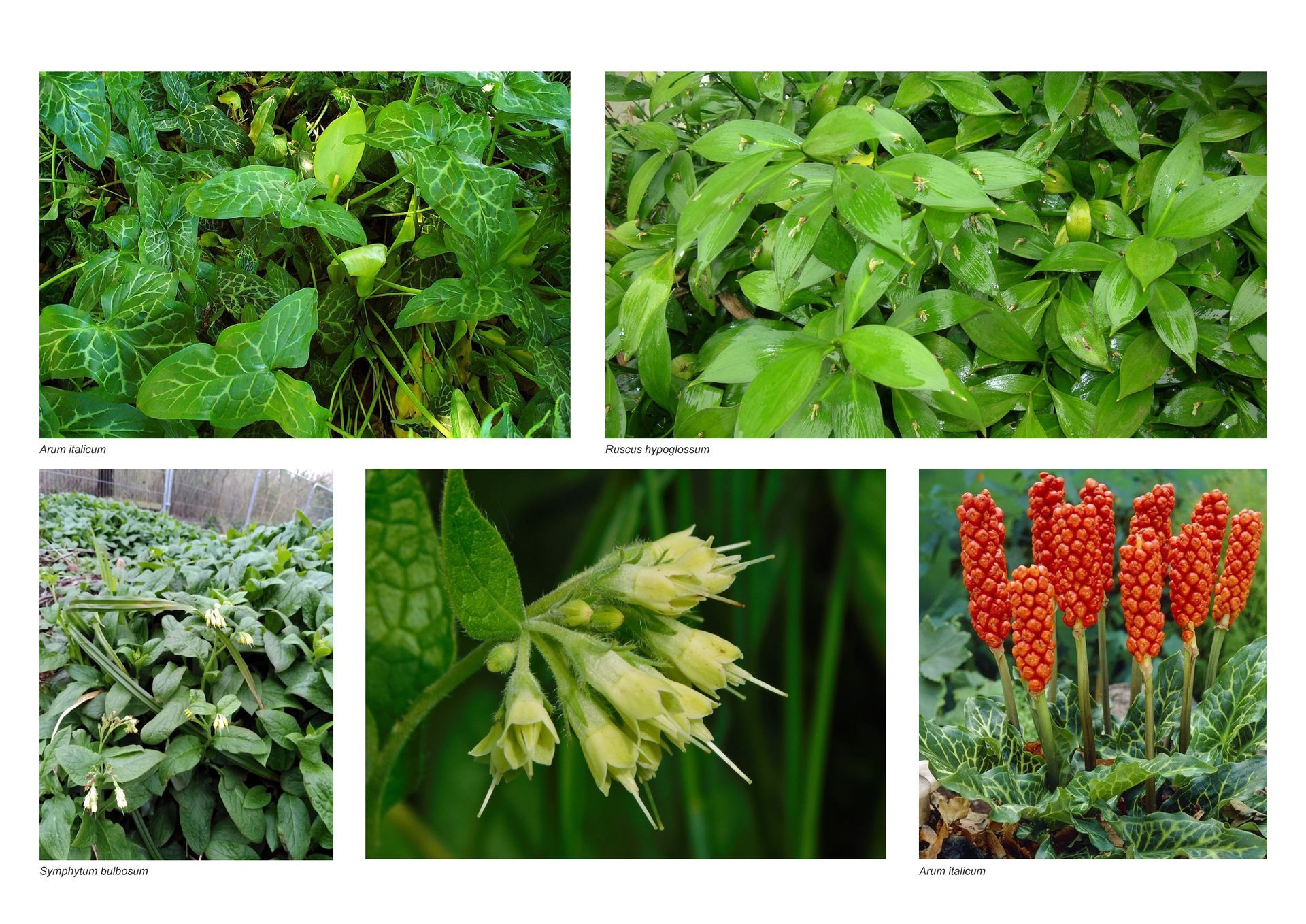 Dans les endroits moins denses notamment vers le canal où plus de lumière arrive au sol, celui-ci est tapissé de plantes sciaphiles caractéristique du climat méditerranéen : L’Arum italicum, le Symphytum bulbosum, Ruscus hypoglossum ou encore d’Hedera hélix (le lierre consacré à Bacchus était symbole de volupté parce que l’on pensait que nuisant au cep de vigne, il protégeait de l’ivresse et permettait de goûter aux plaisirs de la vie sans y sombrer).