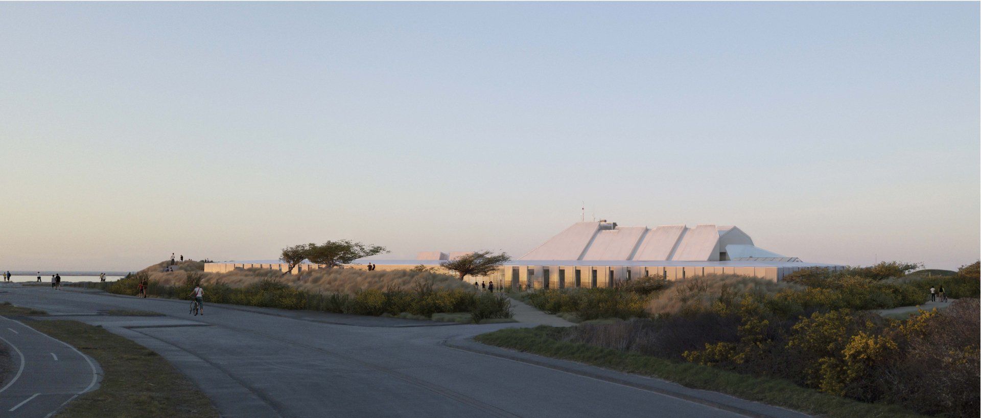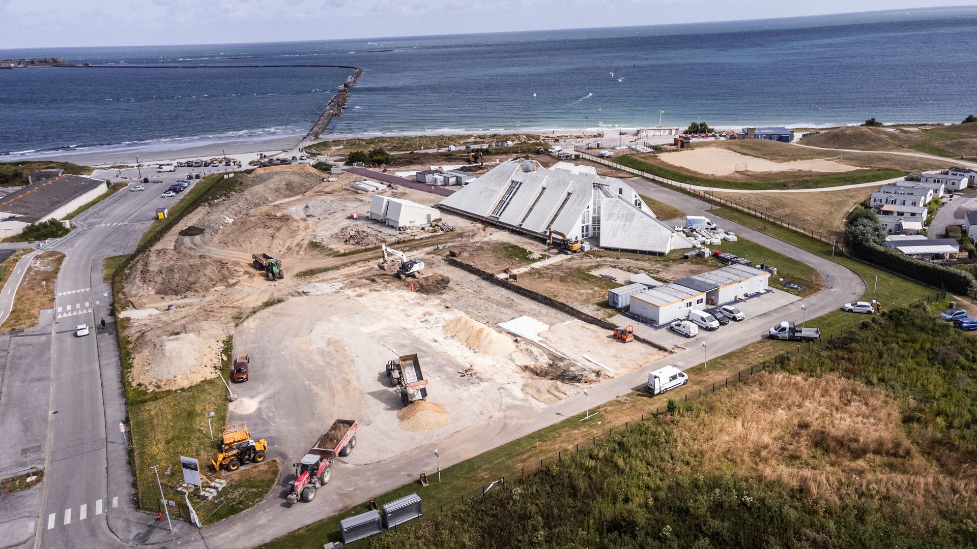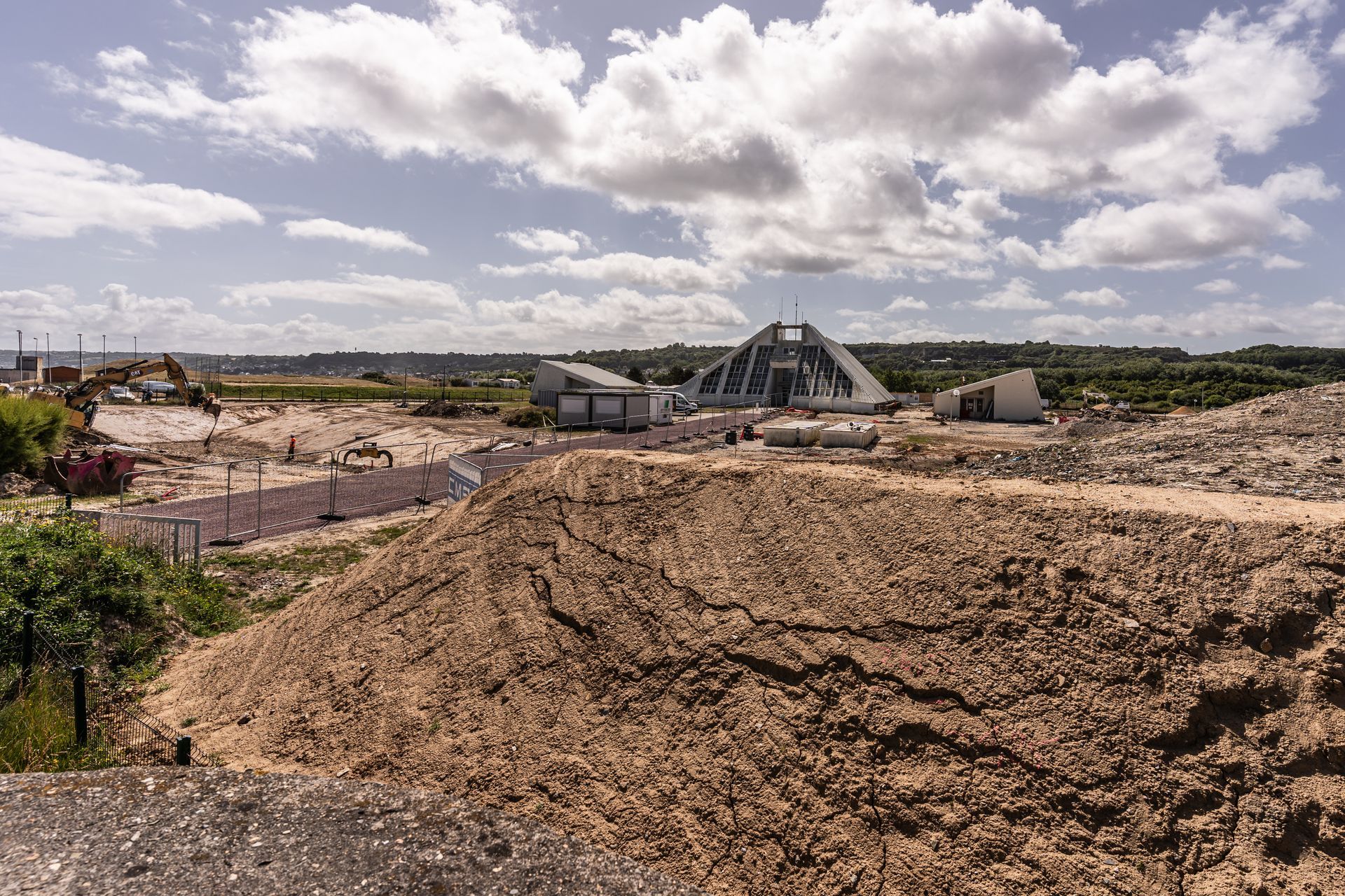 Au nord-ouest du site dans le prolongement de la digue sur un volume de remblais préexistants nous proposons de créer une grande dune «point de vue» vers la mer, abrité du vent qui permette de réaliser des cours et des évènements.