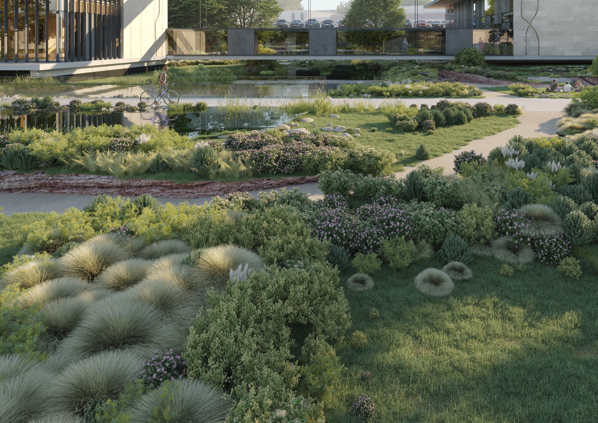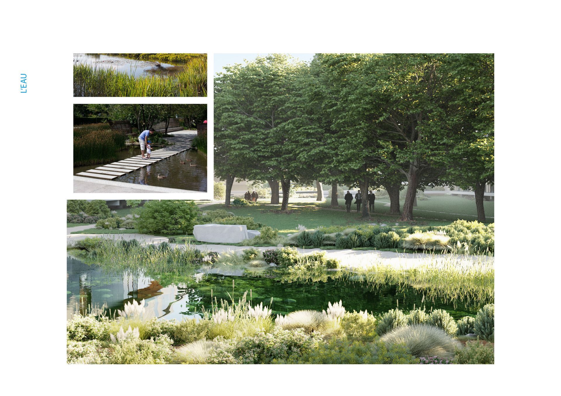 Water: The primary landscape of the banks of the Charente River is reintroduced to the site. Landscaped pools—water mirrors dotted with alders and reeds—integrate the building into the heart of its site. Level settings create numerous reflection effects depending on the viewpoint.