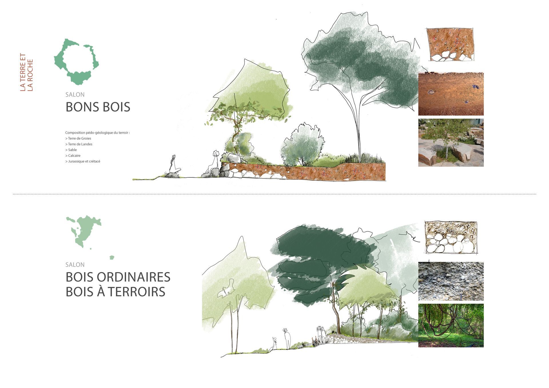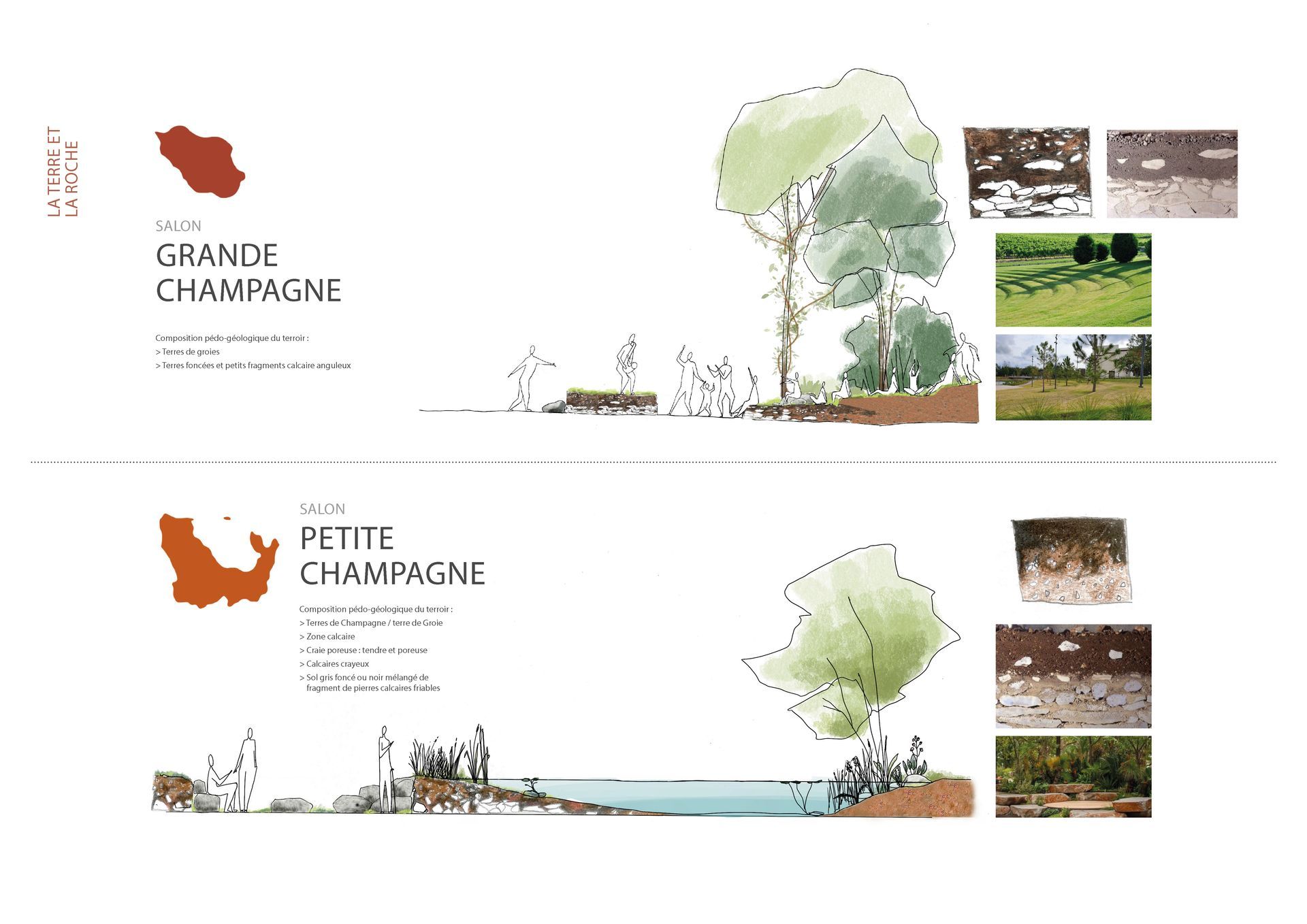 Earth and rock: The gardens evoke the geology of the six terroirs of Cognac. Along the Charente, a series of planted terraces parallel to the river incorporates stages to host concerts during the Cognac Jazz Festival, as well as more intimate spaces in the heart of this garden opening onto the river. In this open space, stages-lounges showcase the different terroirs of Cognac, from Bois Ordinaires to Grande Champagne. The six pedo-geological facies and their horizons are playfully recreated in earth concrete to create landscaped lounges with limestone monolith seats.