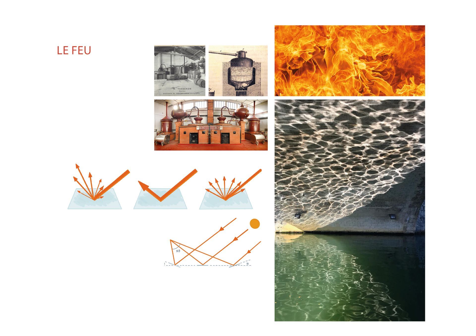 Fire: The sun's path is reflected in the pools on the facades. The water features are positioned to create a shimmer on the limestone facades and ceilings inside the building. This effect symbolizes the fire that distills the elixir of Cognac. On sunny days, the effect continues from morning to sunset, with hues and effects that vary depending on the light and the ripples in the water.