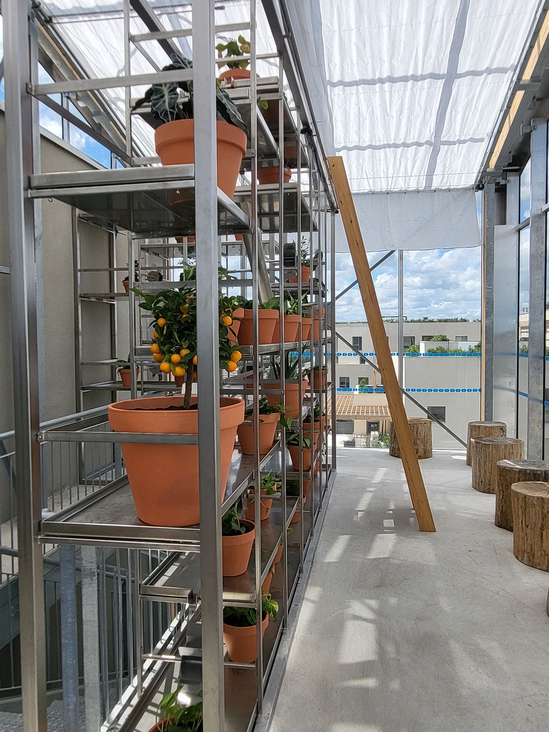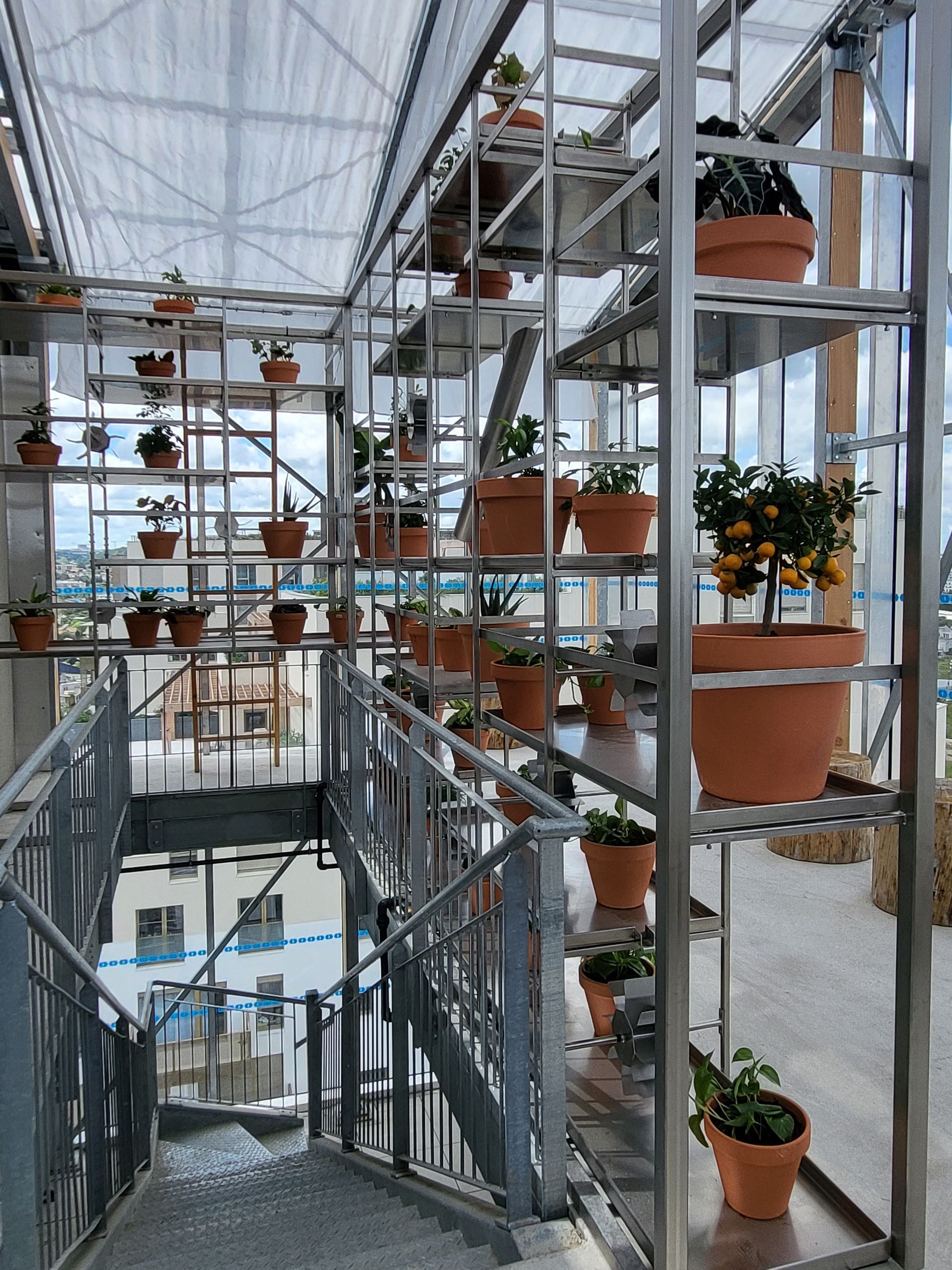 The plant shelf is animated by waterfalls like a Jean Tinguely sculpture, and is gravity-fed by rainwater from roof drainage. Thanks to integrated sensors, the shelf detects the soil moisture level and triggers watering only when necessary, thus avoiding overwatering and the risk of root rot.