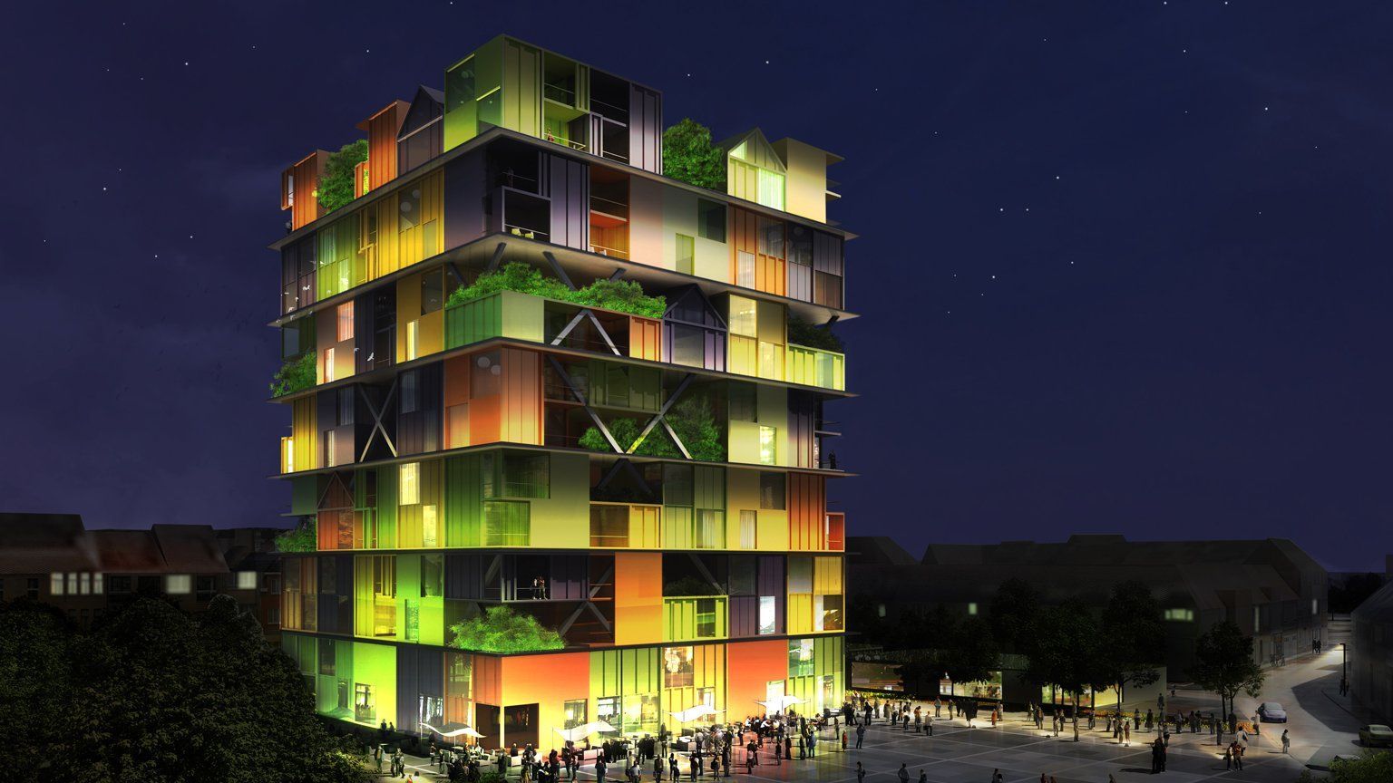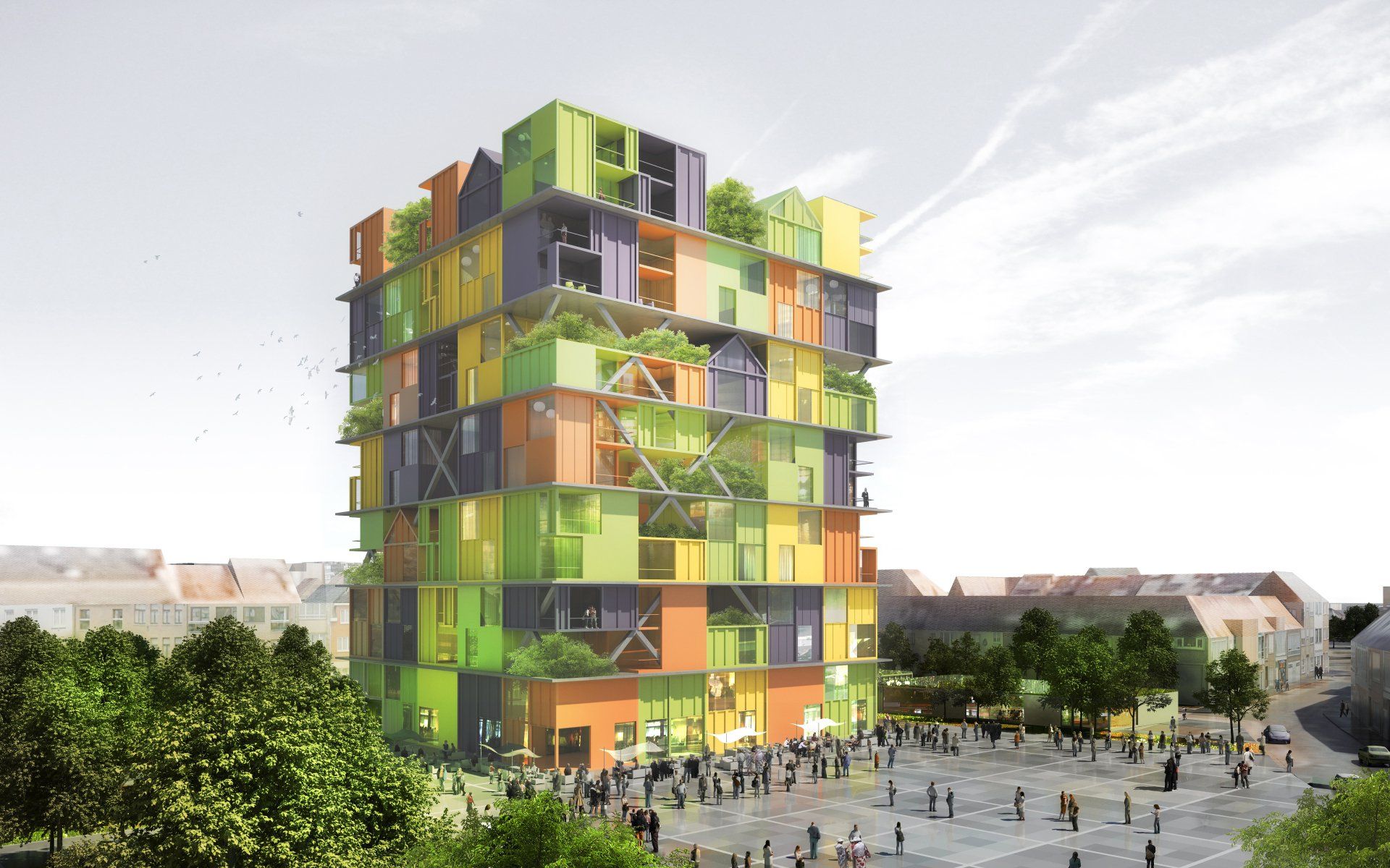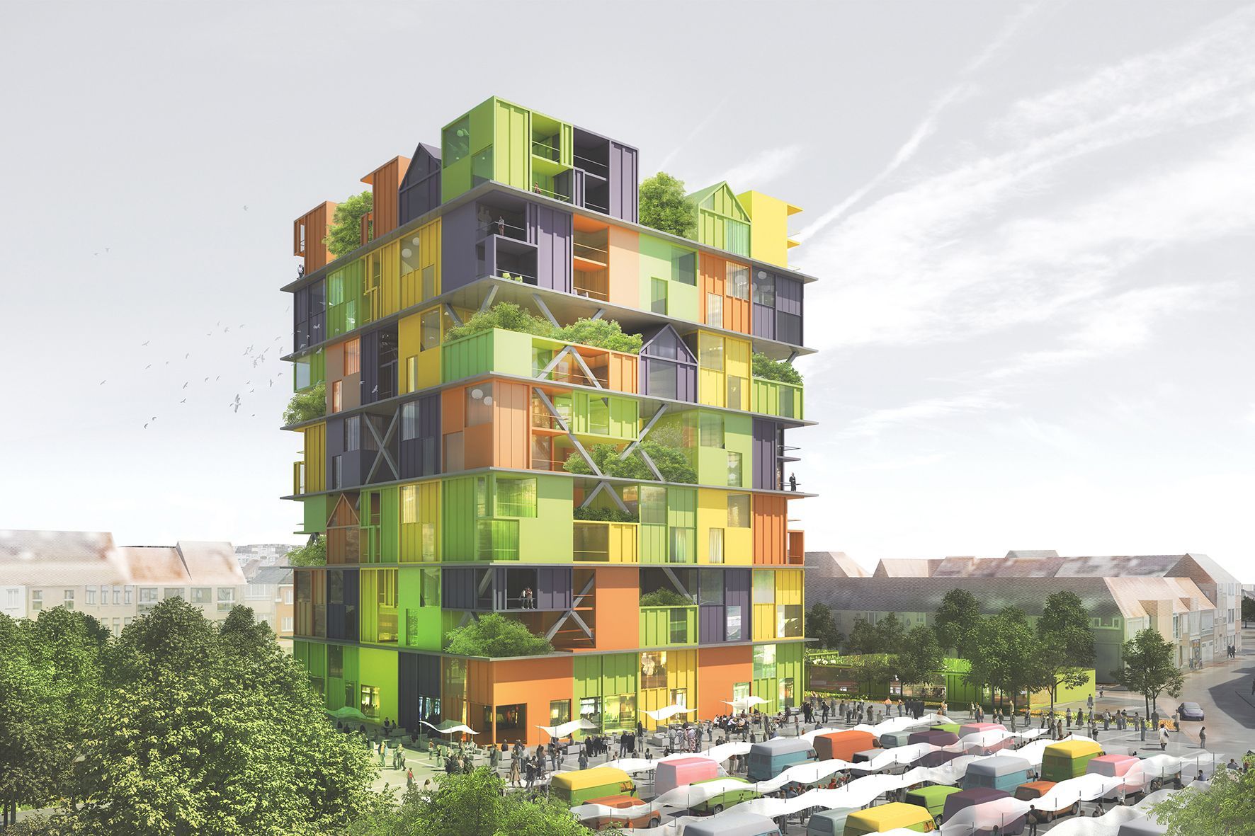 The mixed tower (town hall + shops + housing) is planted with hanging gardens adapted to the coastal microclimate characterized by a strong sea wind in the upper floors (max. 300km/h at 50 meters). The trees in the tower are anemomorphic sculptures whose species are chosen to have a flexible branching that bends but does not break during storms: Hippophae rhamnoides, Cratægus monogyna, Cupressus marcrocarpa, Tamarix gallica, Quercus ilex, Olea europaea… Participatory greenhouses allow self-consumption. On the ground, a public square on a slab hosts a weekly market, shops, an active public garden and an inaccessible dune climax garden.