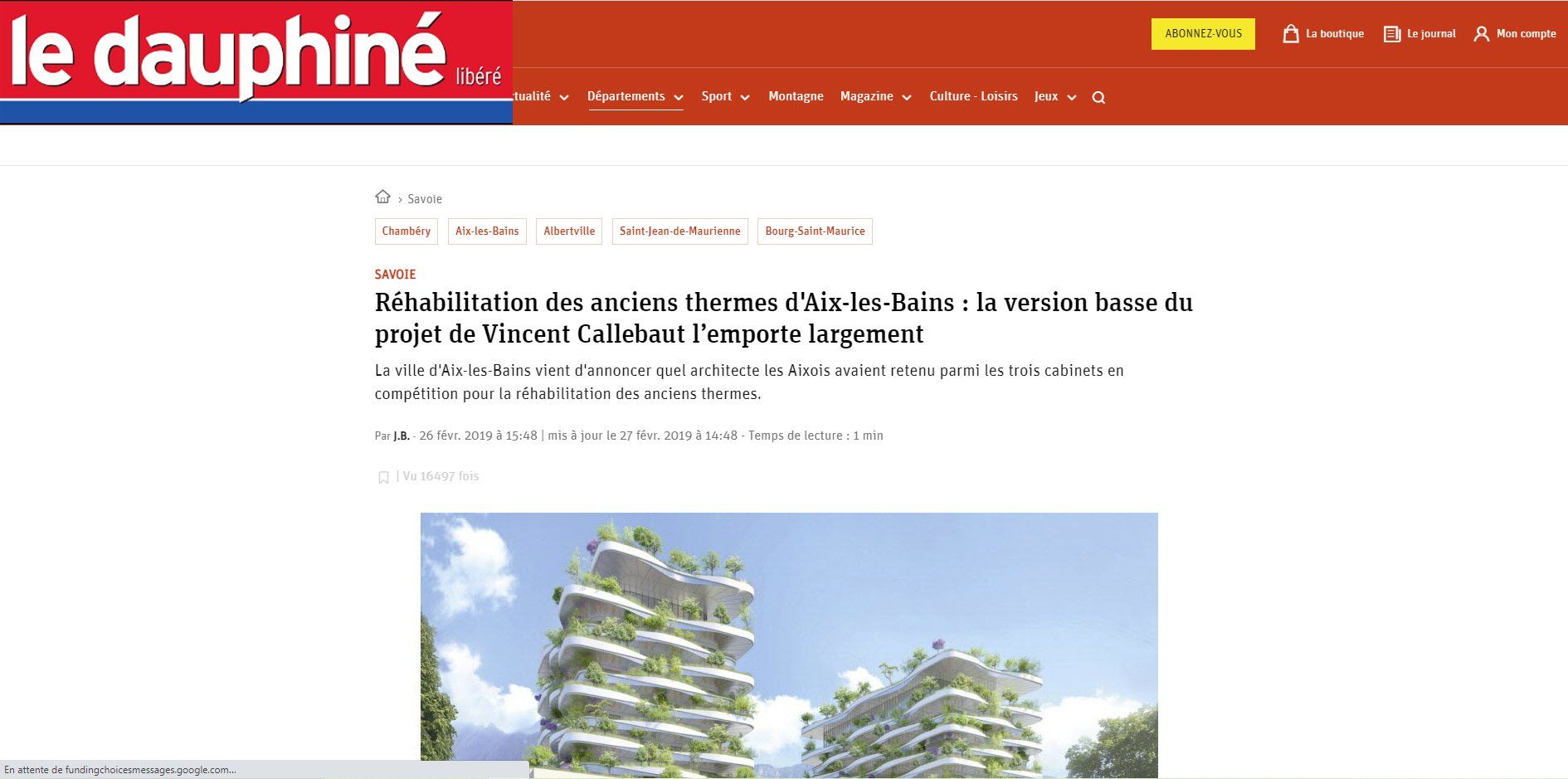 Aix-les-Bains From February 9 to 23, the residents of Aix were able to participate in the consultation launched by the municipality concerning the various rehabilitation projects for the former national thermal baths. In 15 days, 4,689 votes were counted, and the low-rise version of the project by architect Callebaut was the one chosen with 62.89% of the vote. It beat the high-rise version by the same architect (13.35%) and the "high" project by the Viguier firm (8.80%). The group and the City will now begin a phase of work with government services. "Like any project of this magnitude, this project is likely to undergo amendments, improvements, and developments before seeing the light of day in its final version," the statement noted.Lien -