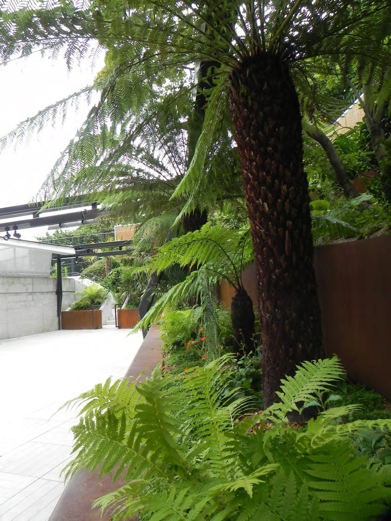 Concept: The new welded coten steel supports adapt to the topography of the natural terrain. The same orange shade of iron oxide (Fe2O3) colors these organic blades and the clay of the tennis courts. The project enhances the existing landscape heritage.