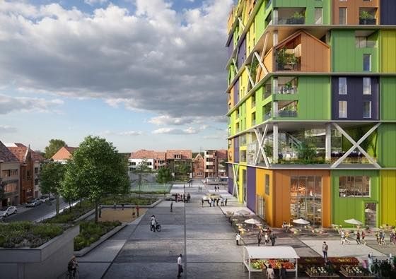 Dédiée aux aménagements extérieurs, cette dernière source d’inspiration végétale révèle l’ampleur de la mission confiée par l’architecte mandataire au paysagiste, autour de trois piliers : la végétalisation de la tour, comprenant trois serres participatives et éclairées en soirée, au 6ème et au 14ème étage ; la toiture de la grande surface commerciale, plantée sur un substrat de 40 à 60 cm d’épaisseur ; et enfin l’esplanade publique, y compris dans sa fonction de voirie lourde pour l’accueil du marché.
