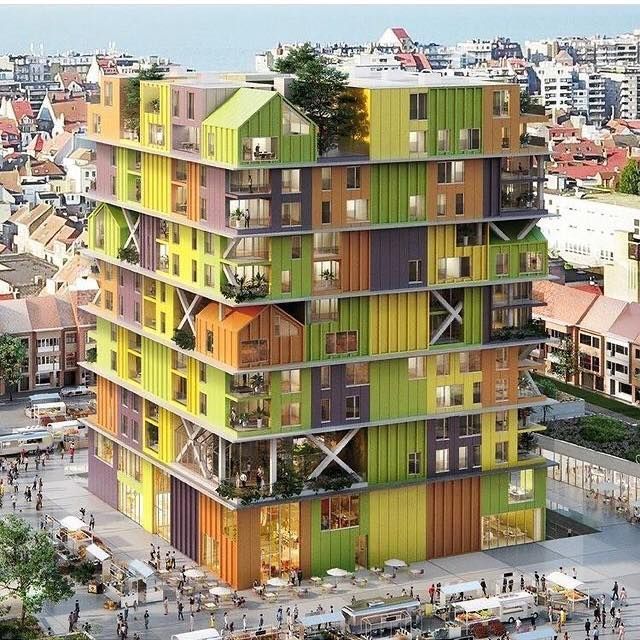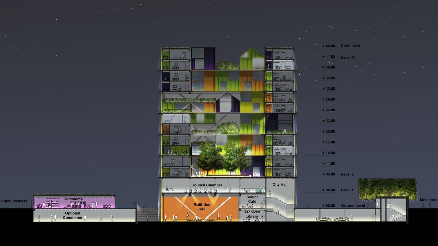 La tour mixte (mairie + commerces + logements) est plantée de jardins suspendus adaptés au micro-climat littoral caractérisé par un vent marin important dans les étages supérieurs (max. 300km/h à 50 mètres). Les arbres dans la tour sont des sculptures anémomorphes dont les essences sont choisies pour avoir une ramification souple qui plie mais ne rompt pas lors des tempêtes: Hippophae rhamnoides, Cratægus monogyna, Cupressus marcrocarpa, Tamarix gallica, Quercus ilex, Olea europaea… Des serres participatives permettent l'autoconsommation. Au sol, une place publique sur dalle accueille un marché hebdomadaire, des commerces, un jardin public actif et un jardin climacique de dune inaccessible.