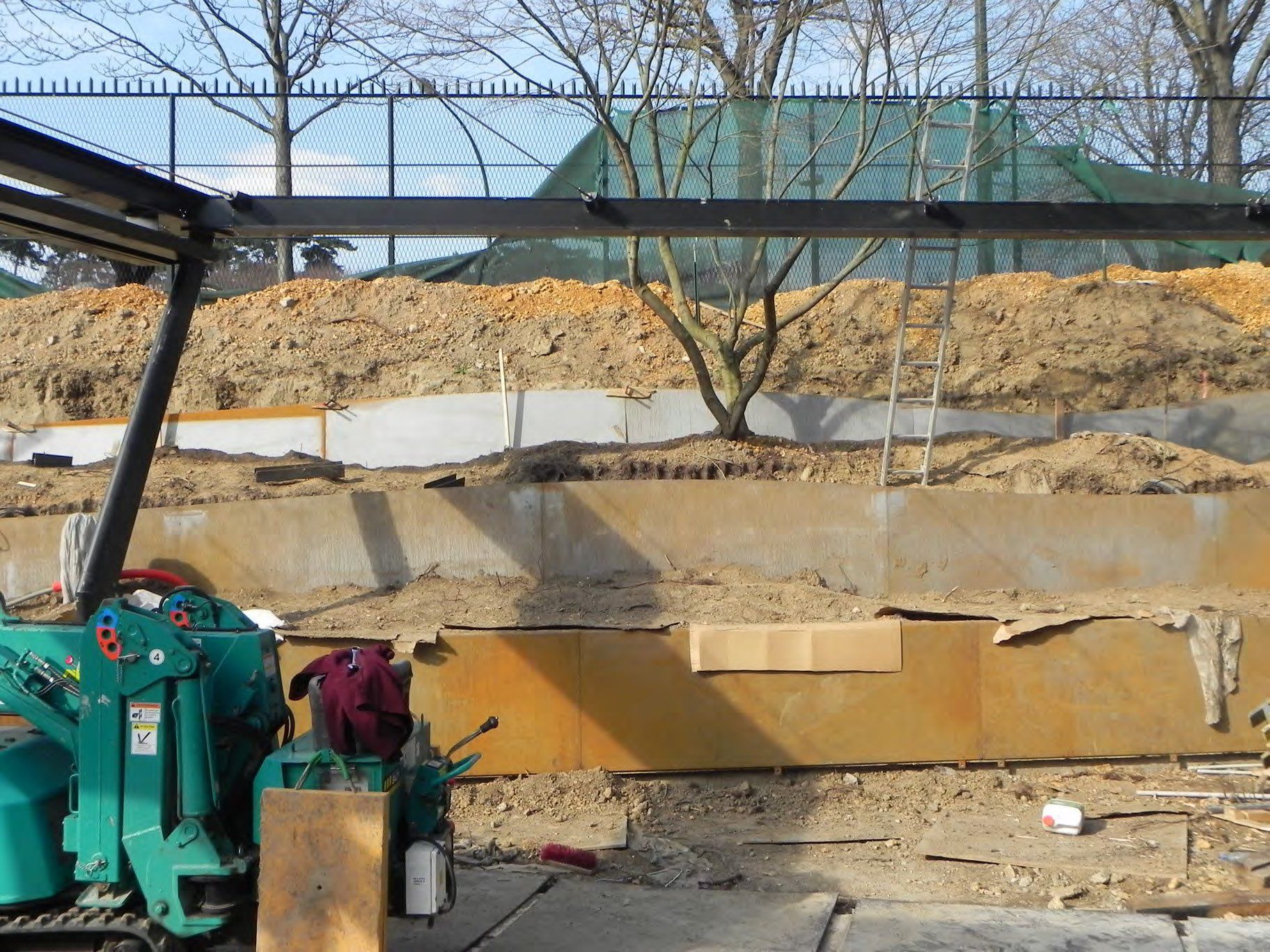 Concept: Les nouveaux soutènements en acier coten soudé s'adaptent à la topographie du terrain naturel. La même teinte orange de l'oxyde de fer (Fe2O3 ) colore ces lames organiques et la terre battue des cours de tennis. Le projet valorise le patrimoine paysager existant.