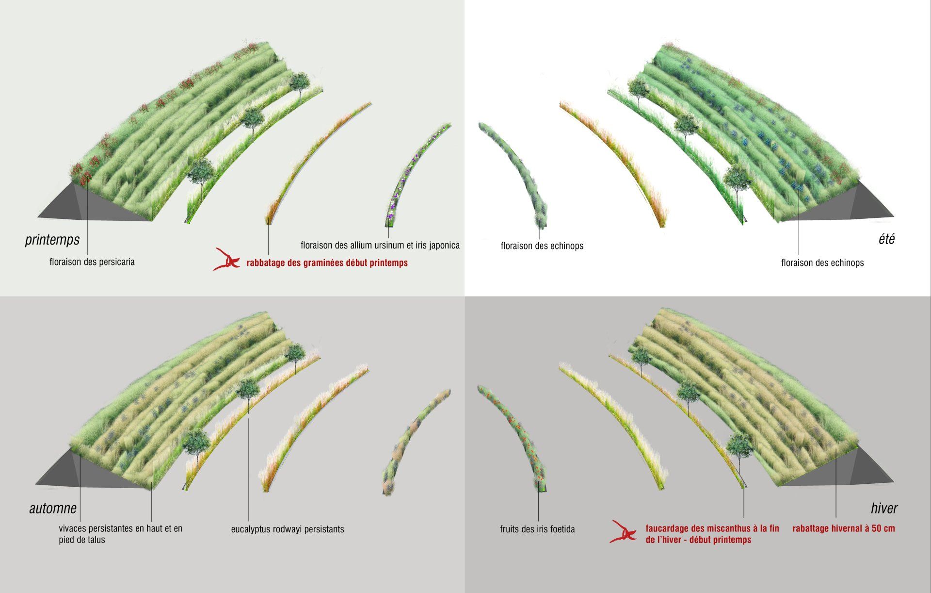 Concept : Des bandes de graminées inscrites dans l'architecture viennent séparer les différents usages: zone piétonne, parking, bus. Le vent fait jouer entre elles ces lignes de graminées.