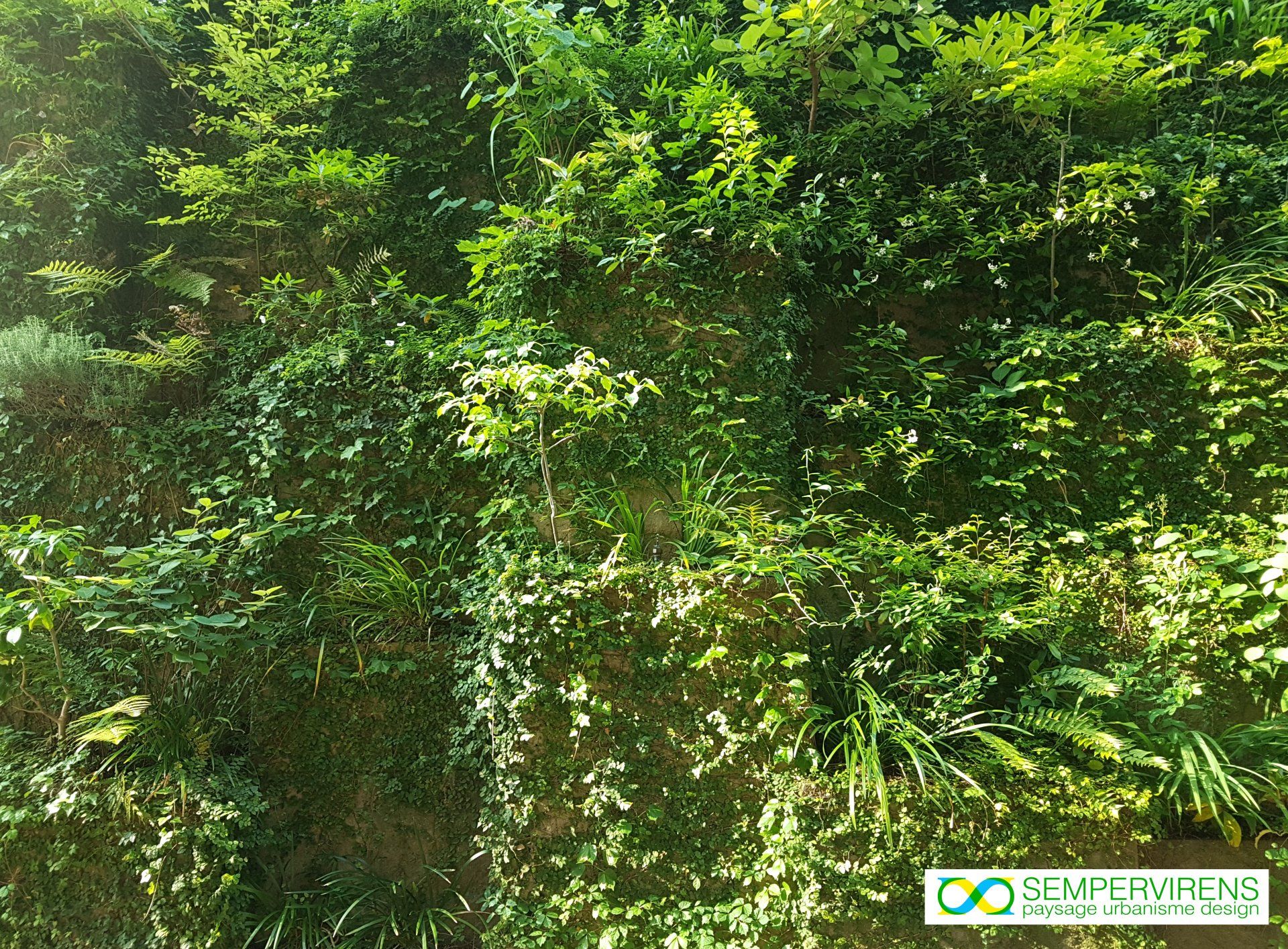 "Les Colonnes Prismatiques Végétales" sont une alliance entre les jardins de mousse japonais et les jardins français dessinés. Mur végétal sculptural extensif colonisé par des mousses et des fougères indigènes. La trame de cet ouvrage de soutènement s'inscrit dans le rythme de la façade en verre du bâtiment . Gestion alternative des eaux pluviales.