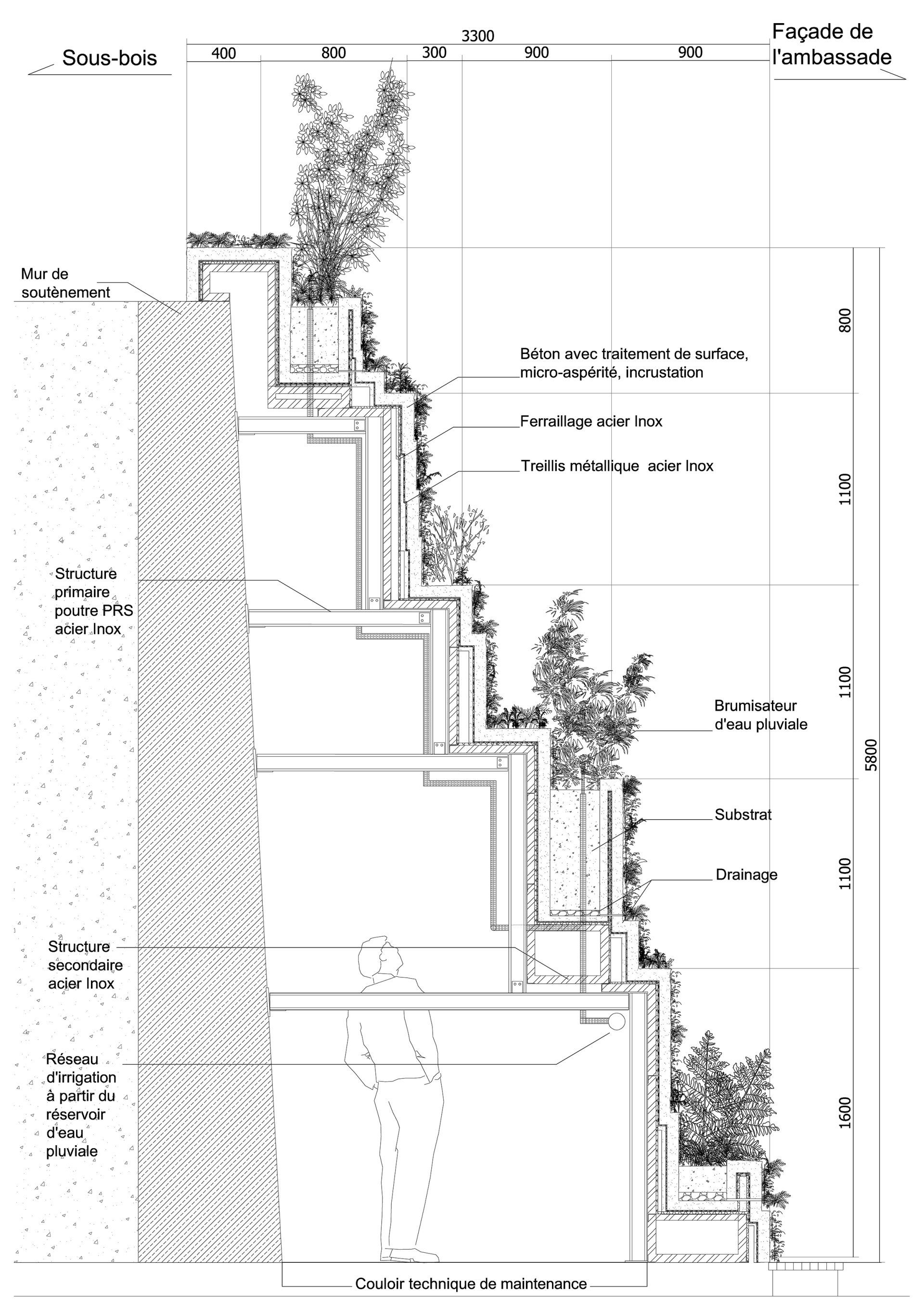 L’architecture de l’ouvrage s’inscrit dans le rythme de la façade du bâtiment pour créer une transition entre l’ambassade et la nature. Les conditions climatiques permettent un arrosage modéré et ponctuel. L’eau consommée est issue du stockage des eaux pluviales du bâtiment dans des réservoirs situés sous la rampe d’accès.