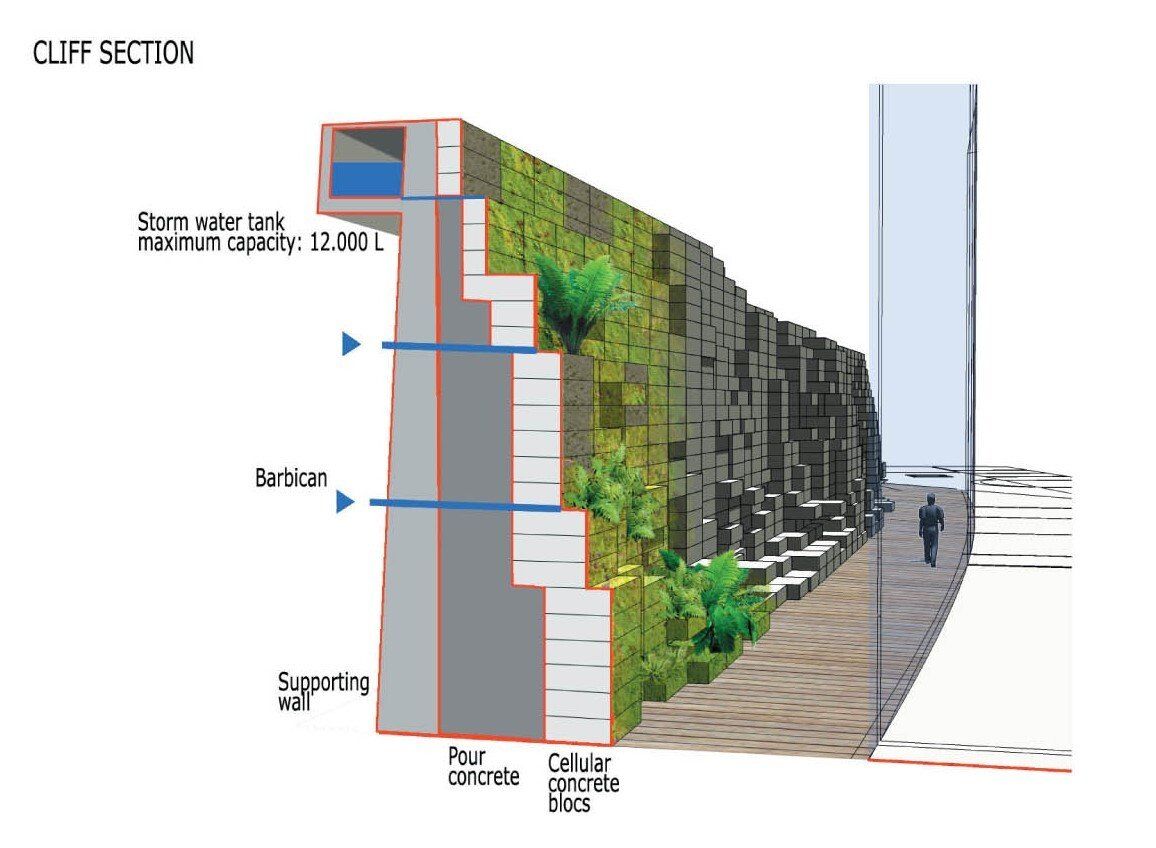 Le fonctionnement de ce mur reste d’une grande simplicité afin d’en assurer la pérennité. Ce parement de surface est aussi issu d’un travail fin sur les conditions de colonisation par les plantes qui nous a amené à établir une granulométrie, un pH mis en œuvre lors de la réalisation de prototypes de test. L’objectif est donc de réunir les conditions pour initier une colonisation naturelle. Nous laissons la nature œuvrer.