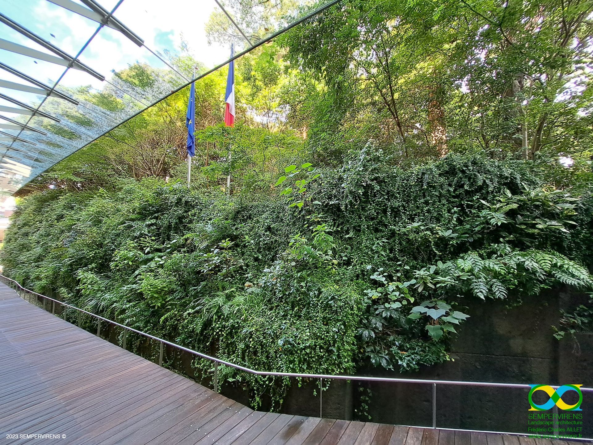 Le projet des Jardins de l’Ambassade de France à Tokyo s’inscrit dans la lignée directe d’une démarche, qui se veut par évidence, environnementale et durable. Ce jardin vertical concilie les jardins japonais de mousses et les jardins à la française dessinés.