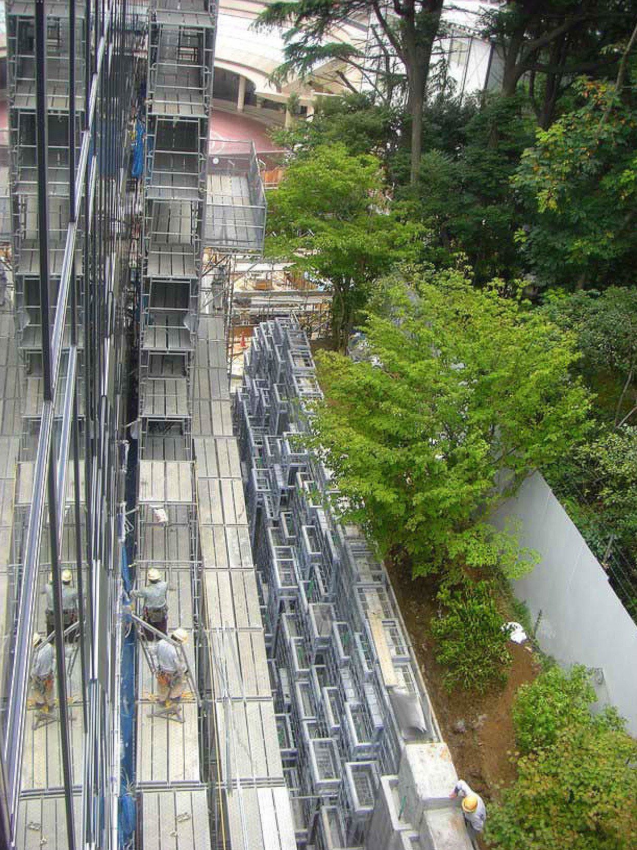 Le projet est né de la nécessité de gérer un dénivelé important entre la façade du nouveau bâtiment et le terrain existant en un minimum d’emprise au sol pour préserver de très grands arbres existants. La contrainte topographique a généré un travail sur la verticalité qui nous semblait alors logique sans vouloir toutefois faire « un mur ». C’est ensuite l’observation in situ des milieux naturels Tokyoïtes d’ombre en bord de rivière, qu’est venue l’idée de faire de la paroi un véritable écosystème qui trouverait son équilibre de manière autonome en réunissant toutes les conditions nécessaires à la colonisation par des plantes pionnières notamment par les mousses (bryophytes).