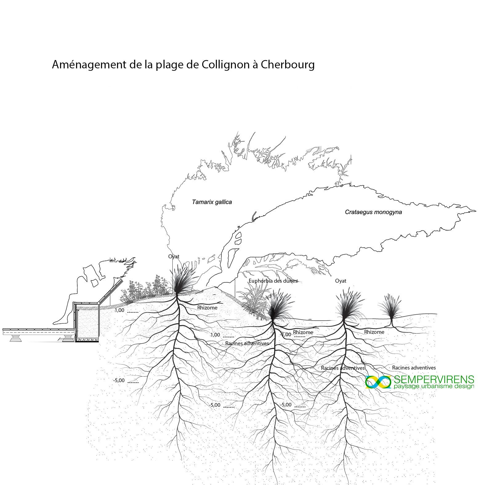 就项目背景而言,瑟堡大港东堤与场地之间有一小段残留沙丘序列。周围海岸地区已大量建设,破坏了野生植被;当然,由于港口的发展,该地点的西边也有,但由于城市化,该地点的东边也有。利用该项目重新建立从海到陆地的原始横断面是很有趣的,事实上这种情况的稀有性使这些生态系统具有非常高的植物学和生态价值。通过这些嗜盐地层(其定义是它们与海洋、盐和风的距离或接近程度),我们建议整合研究所的设备。