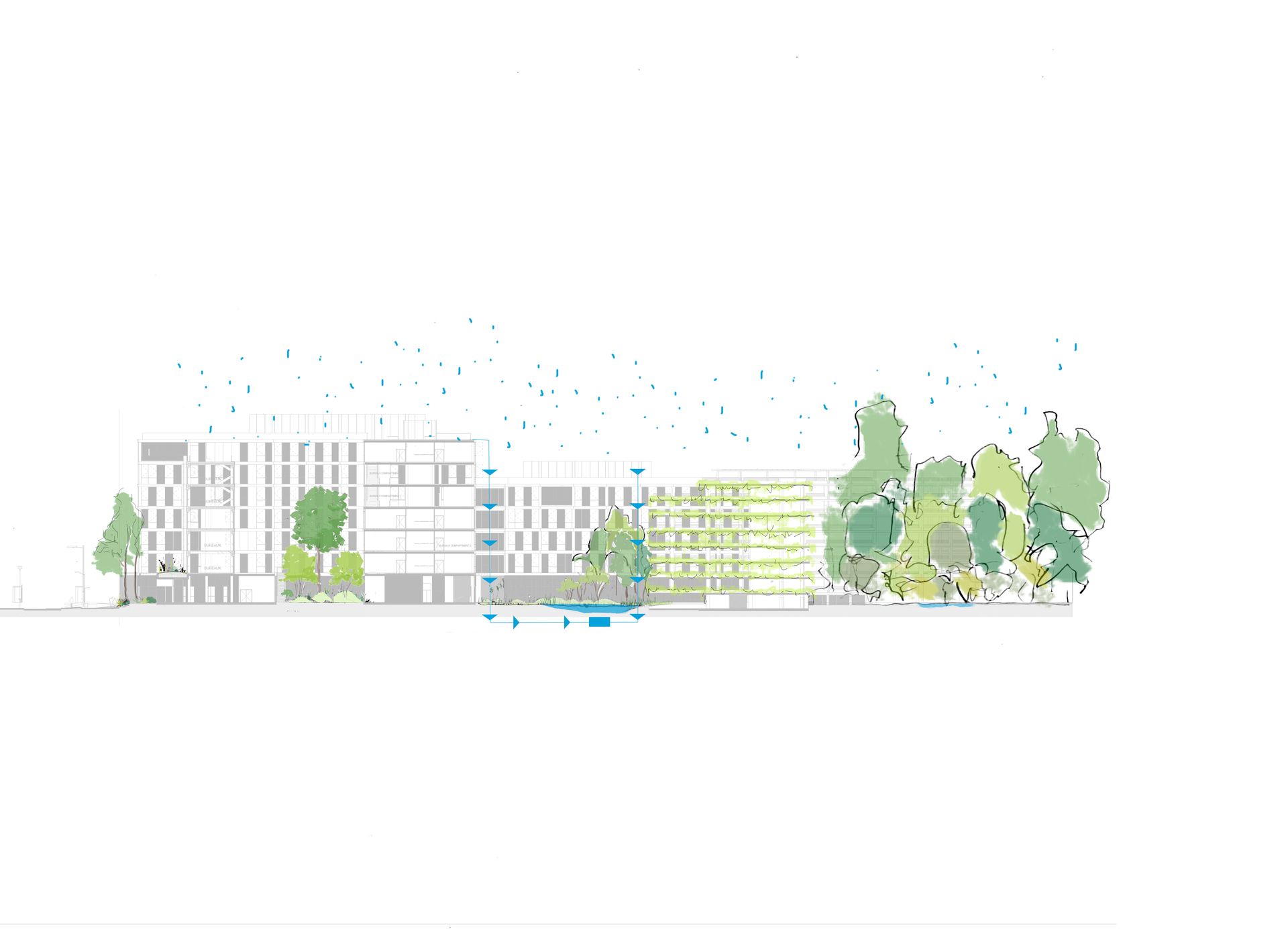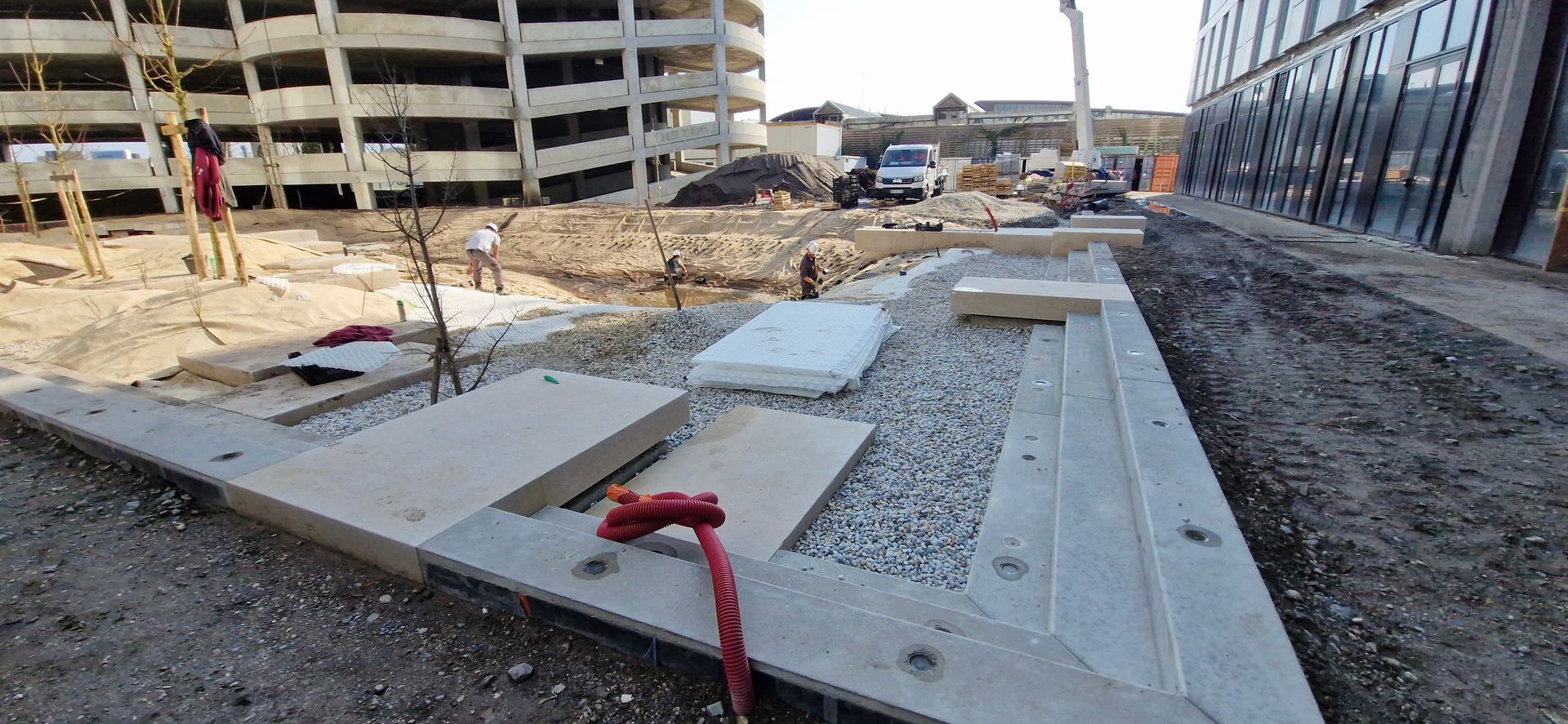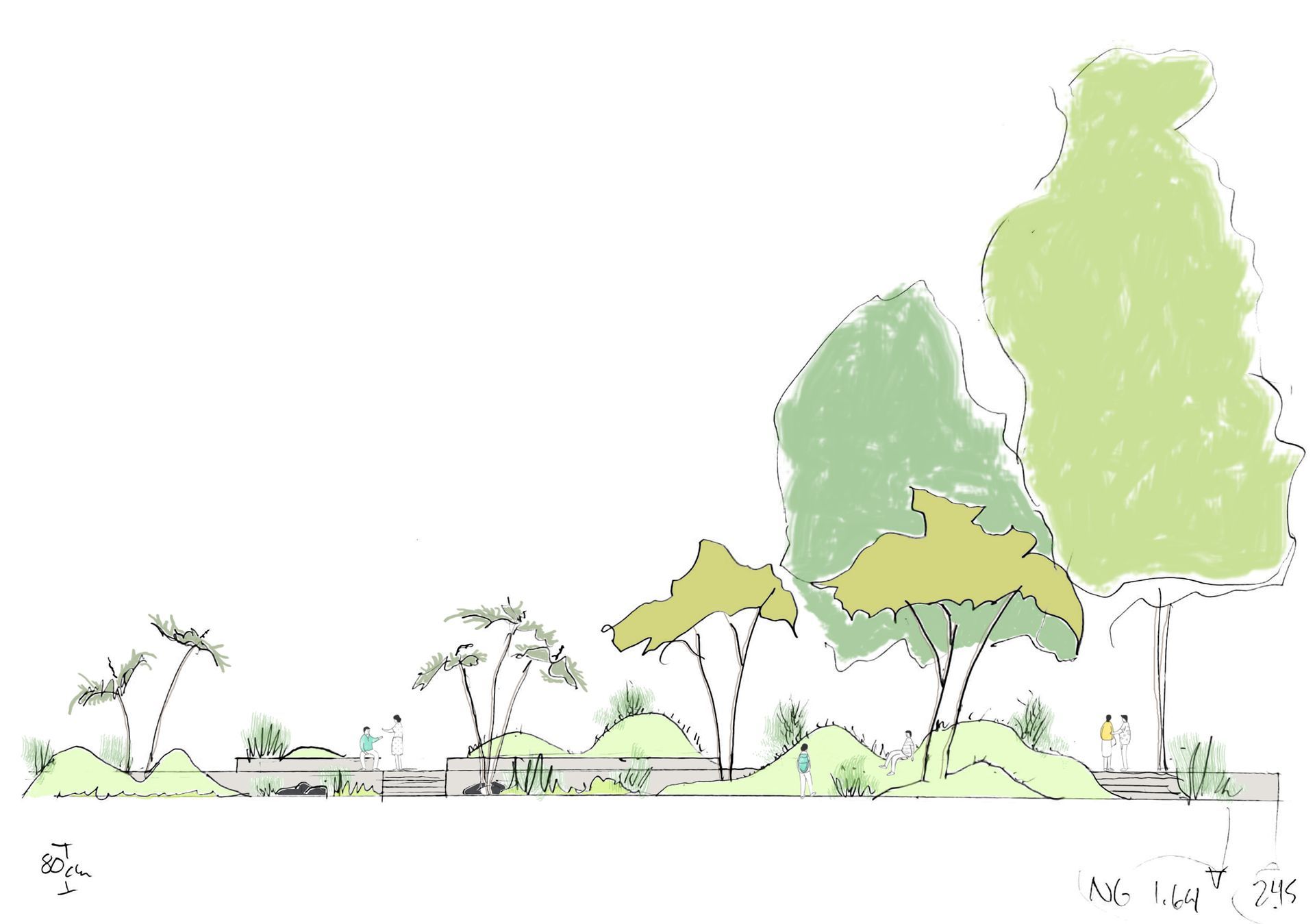 该项目包括建造一个水培池,池中用切割的石头雕刻怪兽,让人联想到卡洛·斯卡帕 (Carlo Scarpa) 的作品。该装置可以收集雨水并灌溉种植筒仓停车场。整个岛屿上布满了由多种波尔多本土植物组成的多环境花园。
