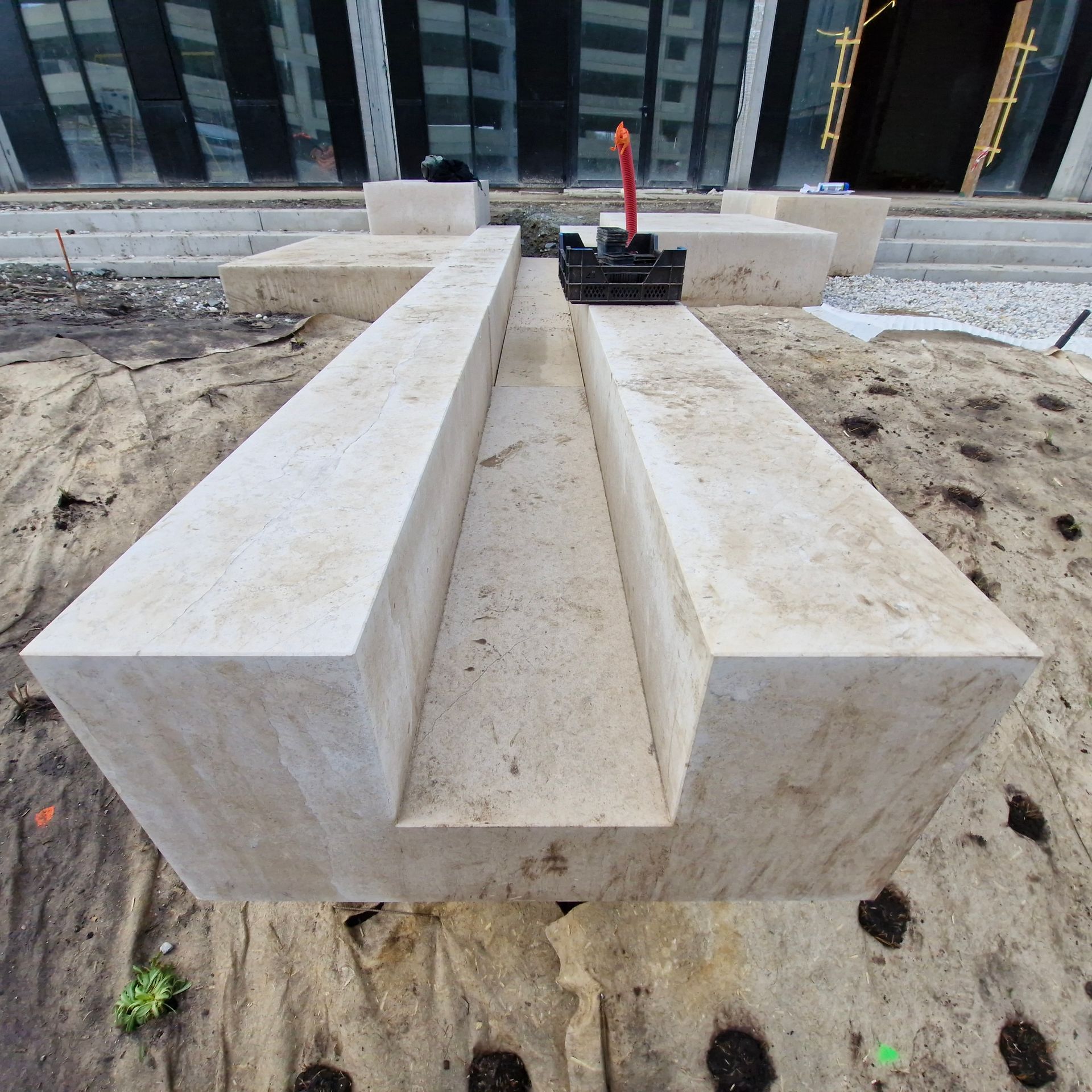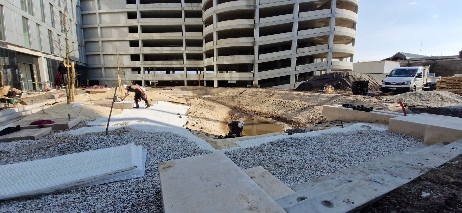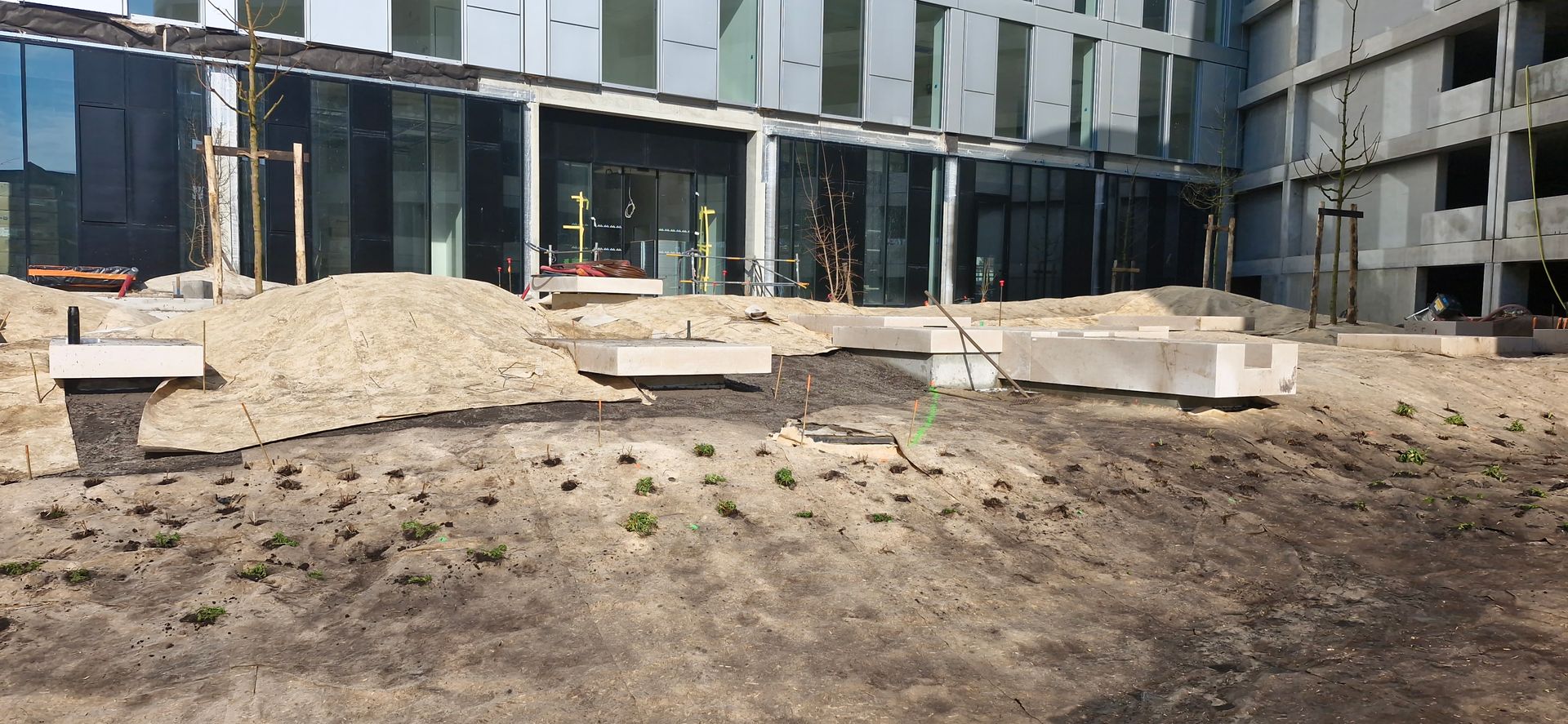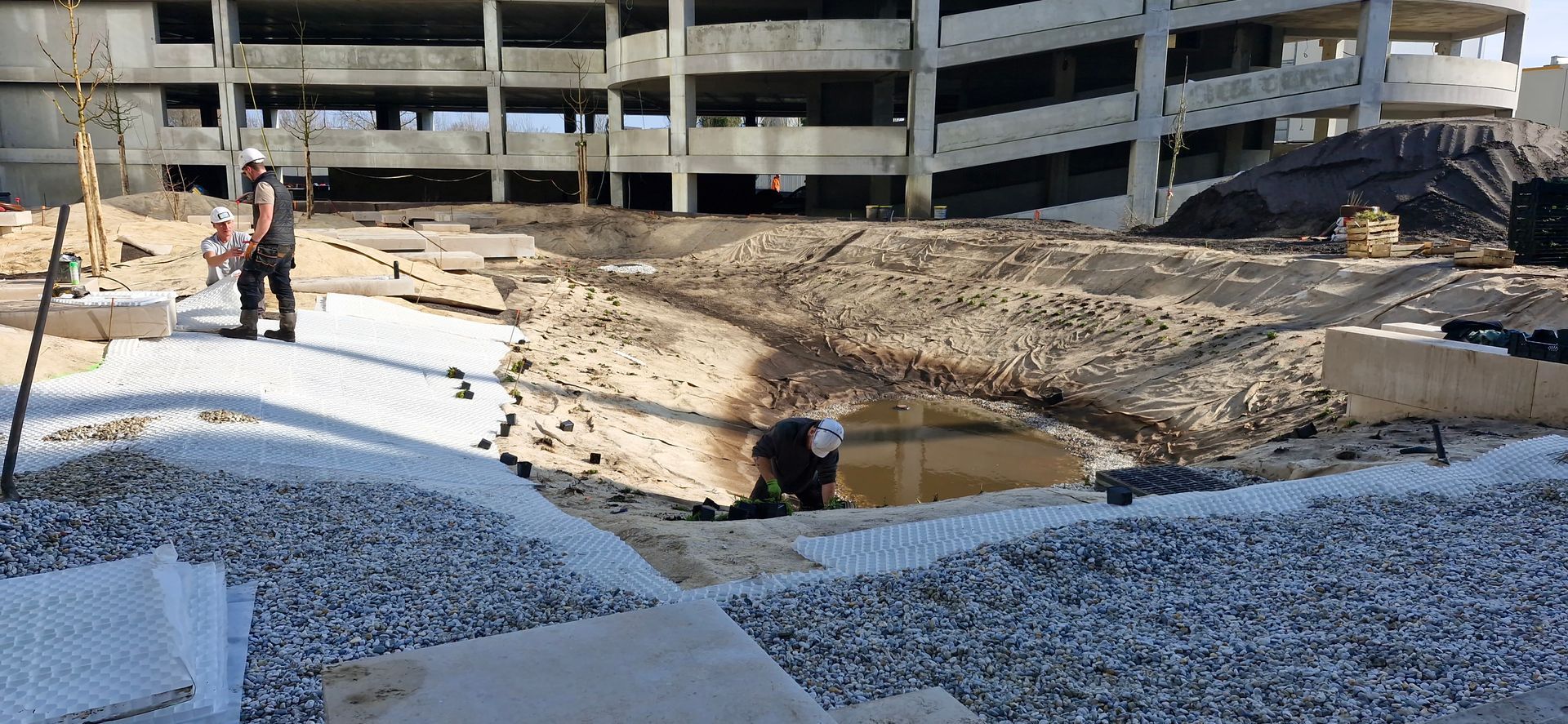 该项目包括建造一个水培池,池中用切割的石头雕刻怪兽,让人联想到卡洛·斯卡帕 (Carlo Scarpa) 的作品。该装置可以收集雨水并灌溉种植筒仓停车场。整个岛屿上布满了由多种波尔多本土植物组成的多环境花园。