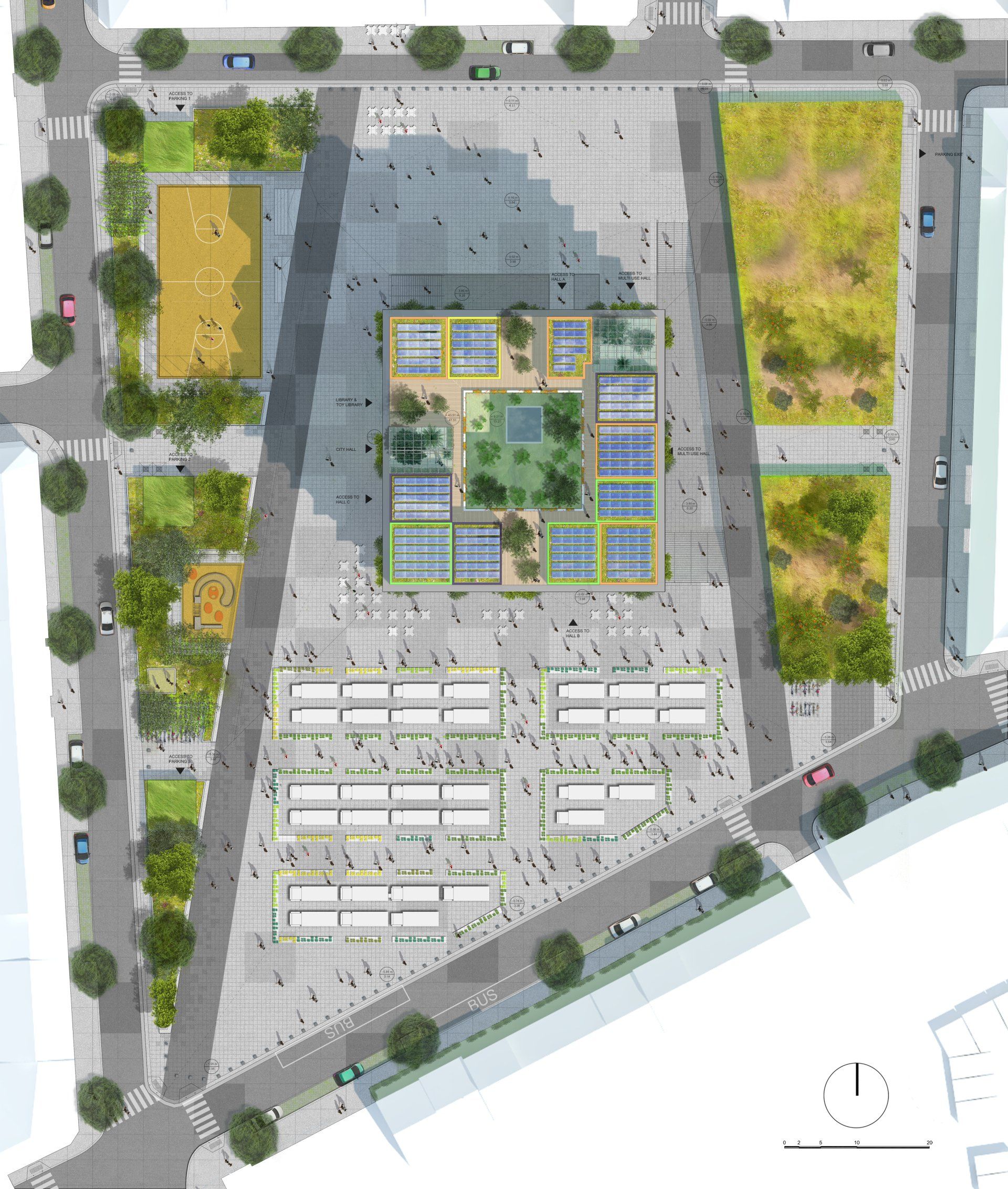 该建筑项目的技术创新之一是树木和灌木的根部锚固采用了双层不锈钢结构:网格包含根球并用作网钩。在温室中,放置在架子上的花盆可以与雨水箱连接。除了预制混凝土之外,景观设计师的创造力还体现在为 17,000 平方米的广场选择预制铺面:沿着由表土支撑的线性长凳,钝化混凝土的粗糙度可防止滑板运动,而是通过专用空间中的抛光板来鼓励滑板运动。为了促进公共空间用途的多样性,Frédéric-Charles Aillet 禁止自己安装禁止在长椅上躺下的装置:这也是推动这一欧洲项目的欢乐精神的体现。