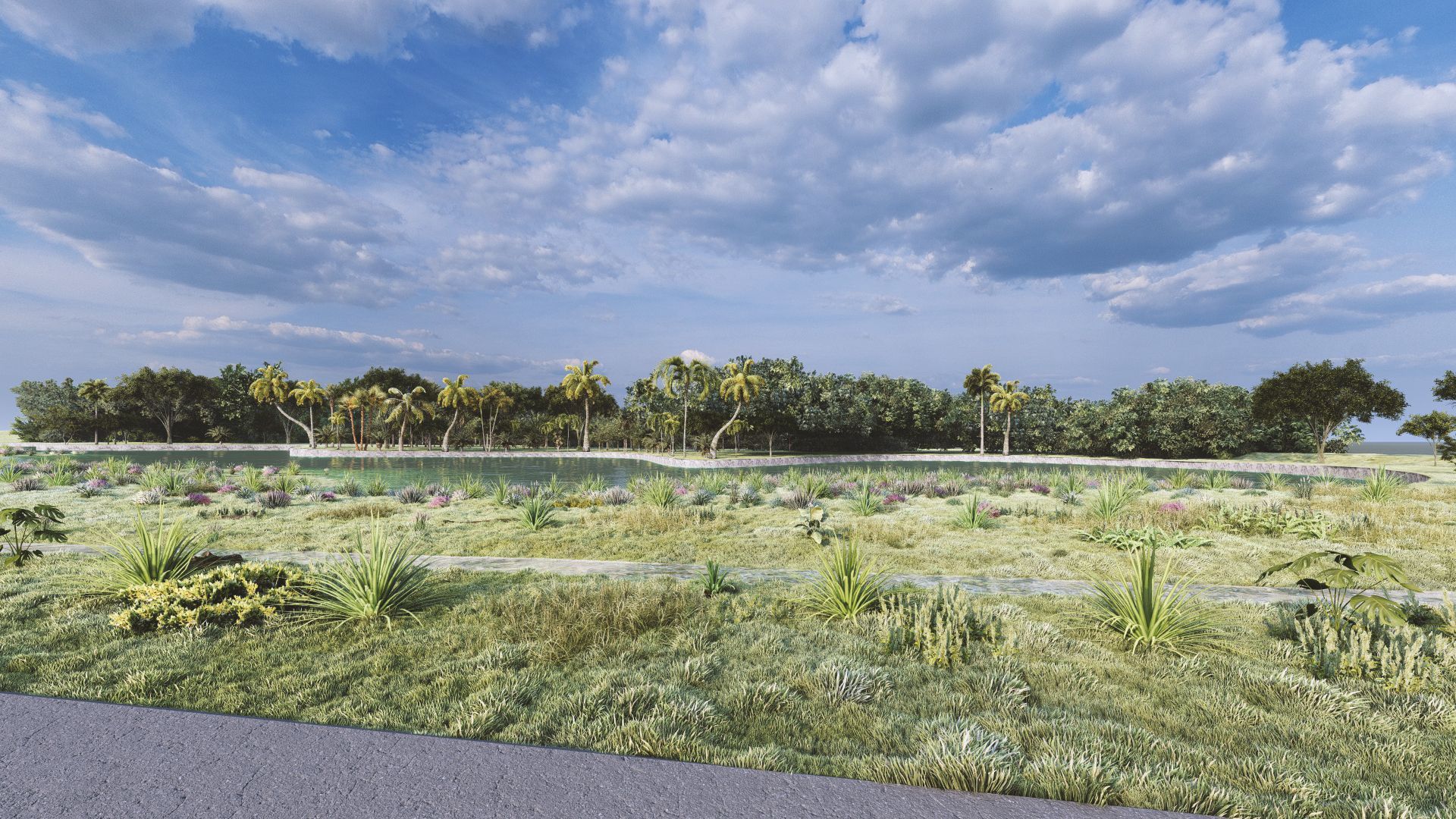 拟建的植被主要由本土物种组成,有助于提高场地的生物多样性,符合 LEED 认证要求,并确保适应性,最大限度地减少绿地维护需求。景观设计仔细考虑了机场的限制:吸引鸟类的植物已被排除在外,标志性的多米尼加椰子树被限制在项目南部,远离道路和停车场,位于大型水库上方。