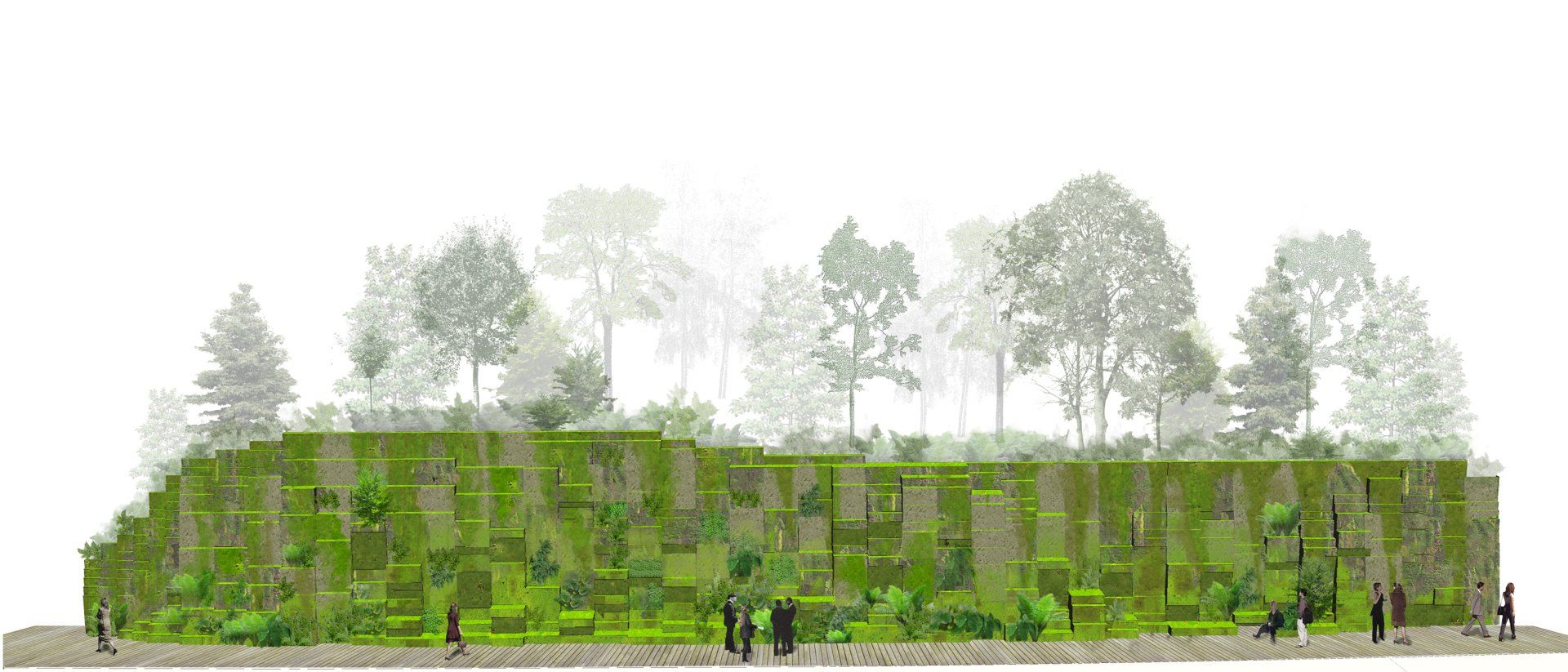 “棱柱状植物柱”是日本苔藓花园与法式园林设计。大面积雕塑绿墙,长满苔藓和蕨类植物本地人。这个挡土结构的结构符合玻璃幕墙的节奏建筑 。雨水的替代管理。