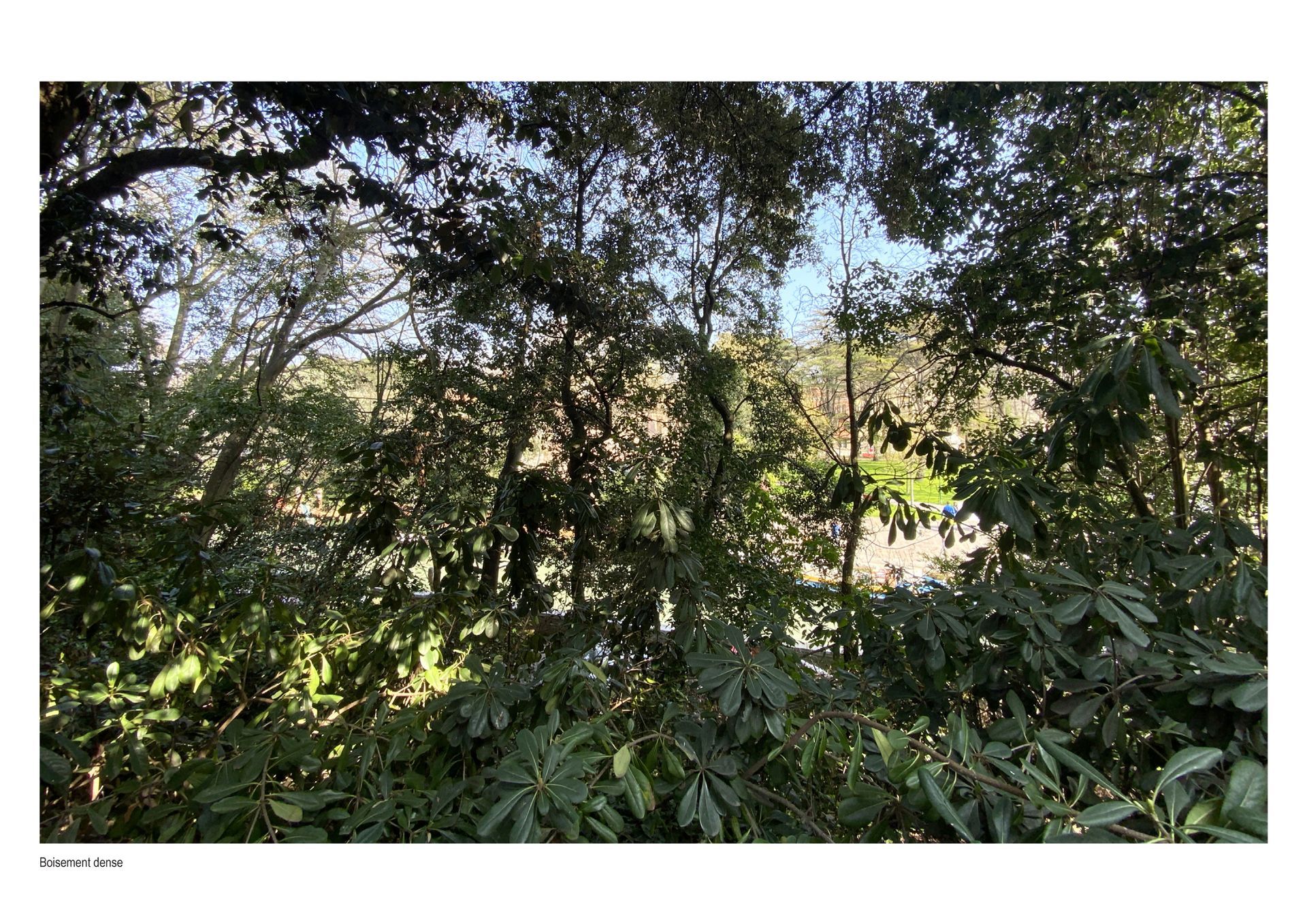 Au Sud du pavillon français, se trouve un boisement dense d’espèces méditerranéennes. Ce site comprend un patrimoine arboré très beau de chêne vert Quercus ilex et de micocoulier de Provence Celtis australis. Des arbres à moyen développement sont venus densifier cette micro-forêt en la rendant quasiment inaccessible. Il y a ainsi des lauriers d’Apollon Laurus nobilis (La mythologie veut en effet que le fleuve Ladon, pour soustraire sa fille Daphné aux avances du plus beau des dieux, transforma cette dernière en laurier), des Pittosporum, des Eleagnus. Une litière forestière tapisse le sol préservé de toute fréquentation humaine.