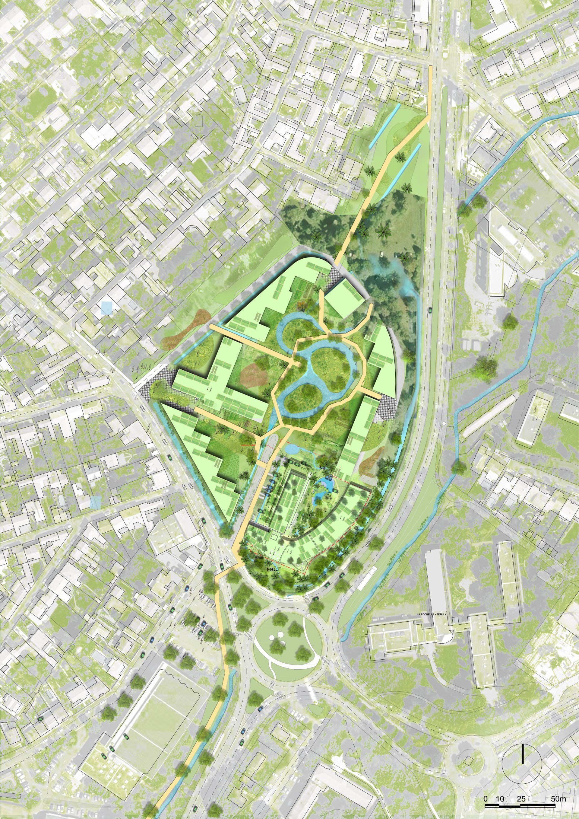 Concept: Located on former marshes, the project restores the wetland ecosystems of the original landscape. Ecological engineering and restoration of the banks of the Lafond. On the architecture, the wind is magnified by the vegetation that it sculpts and careens.